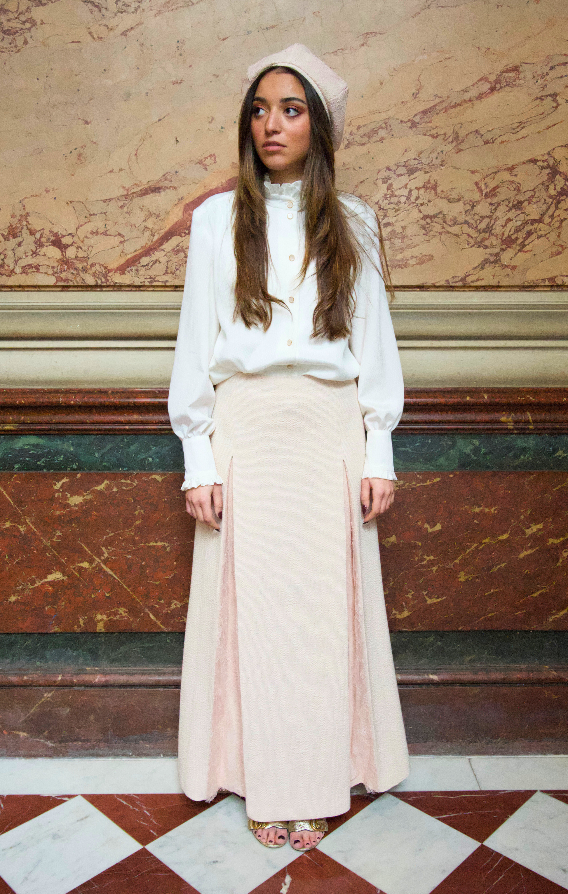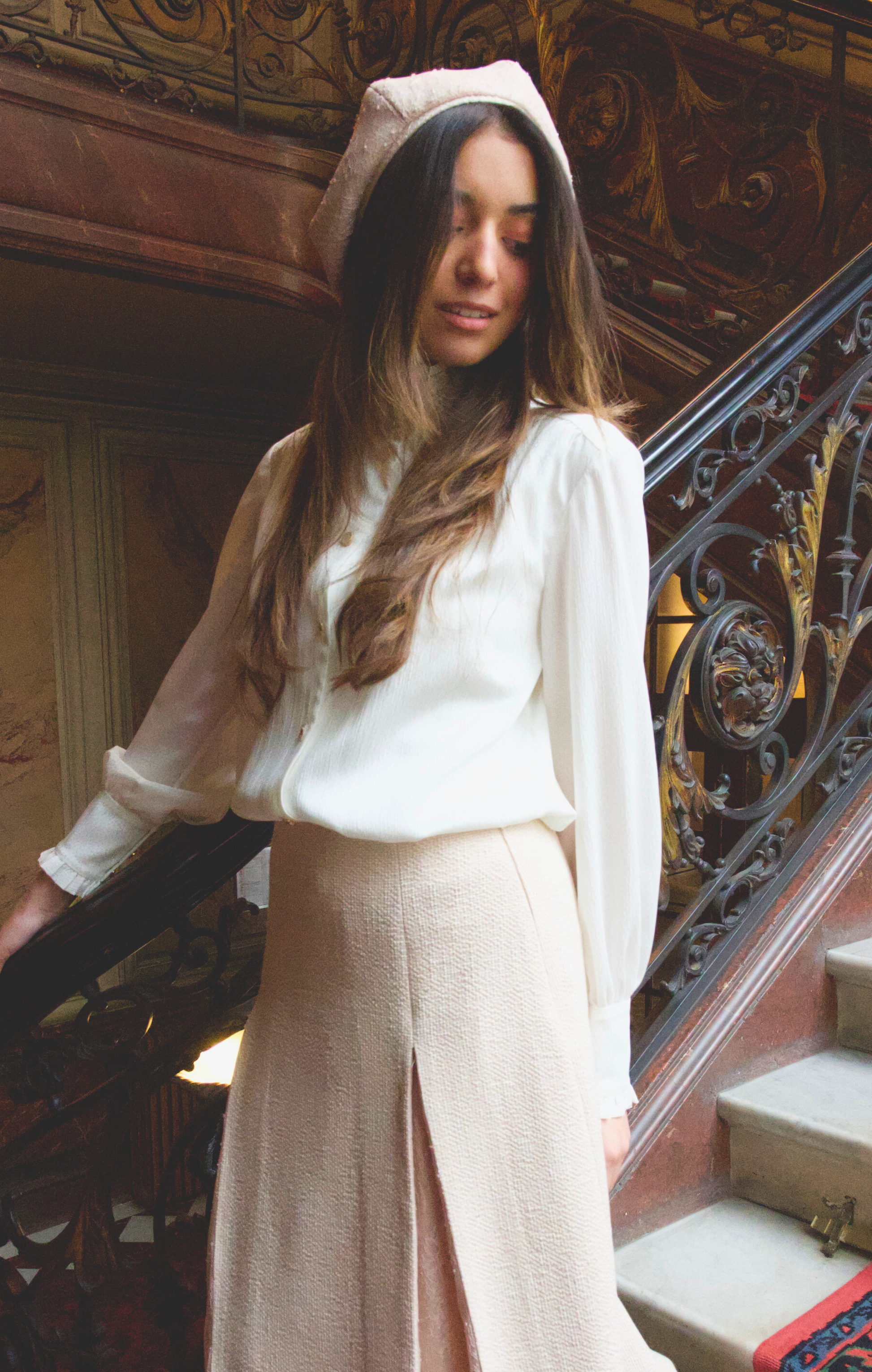 Le béret EMY est travaillé en tweed, avec une superposition de dentelle pour le rendre encore plus féminin.