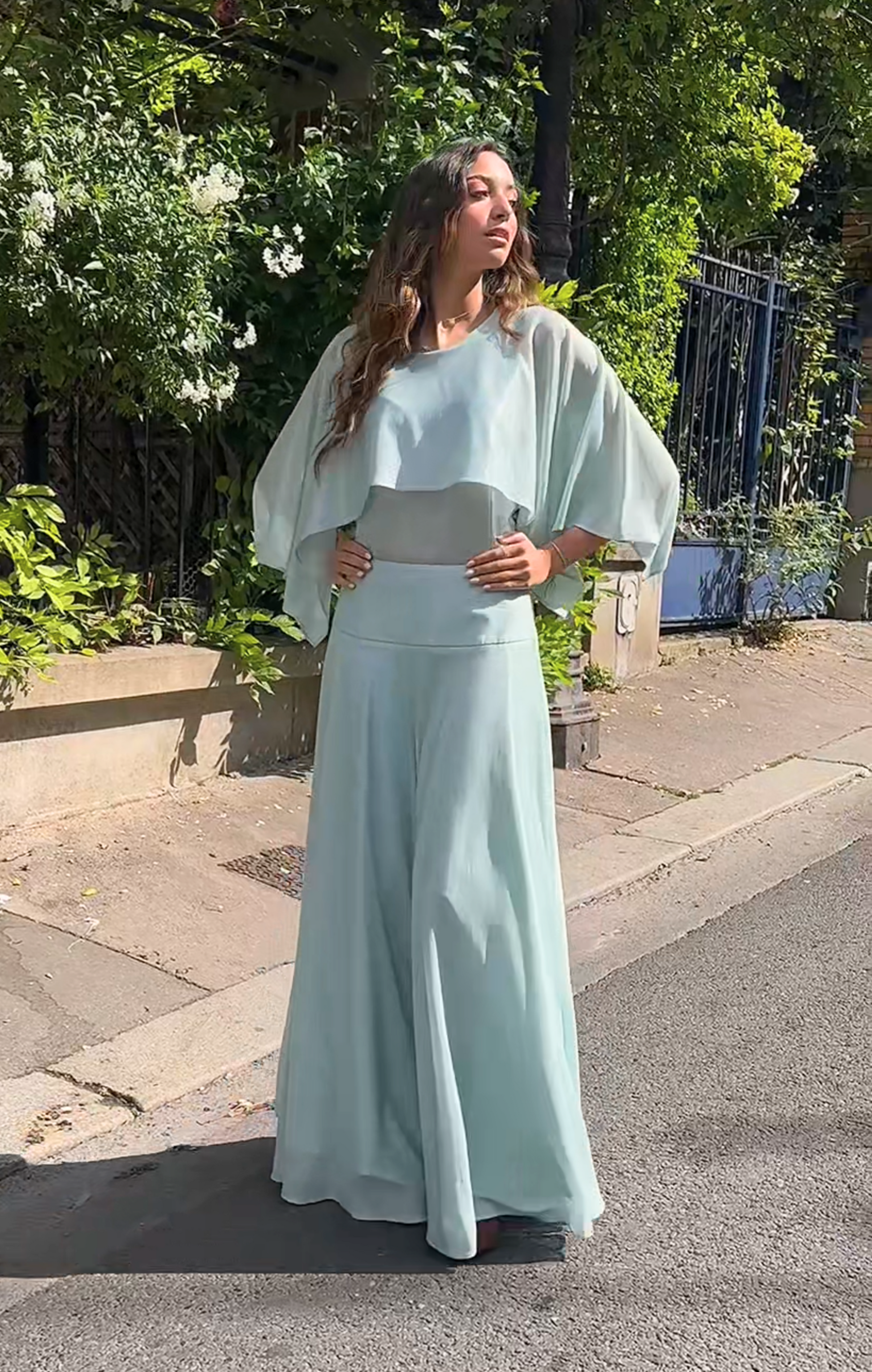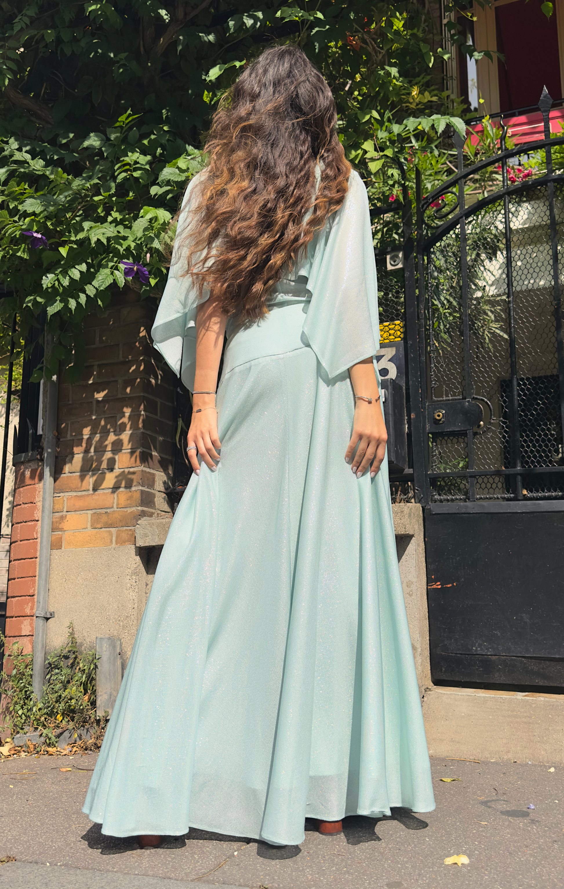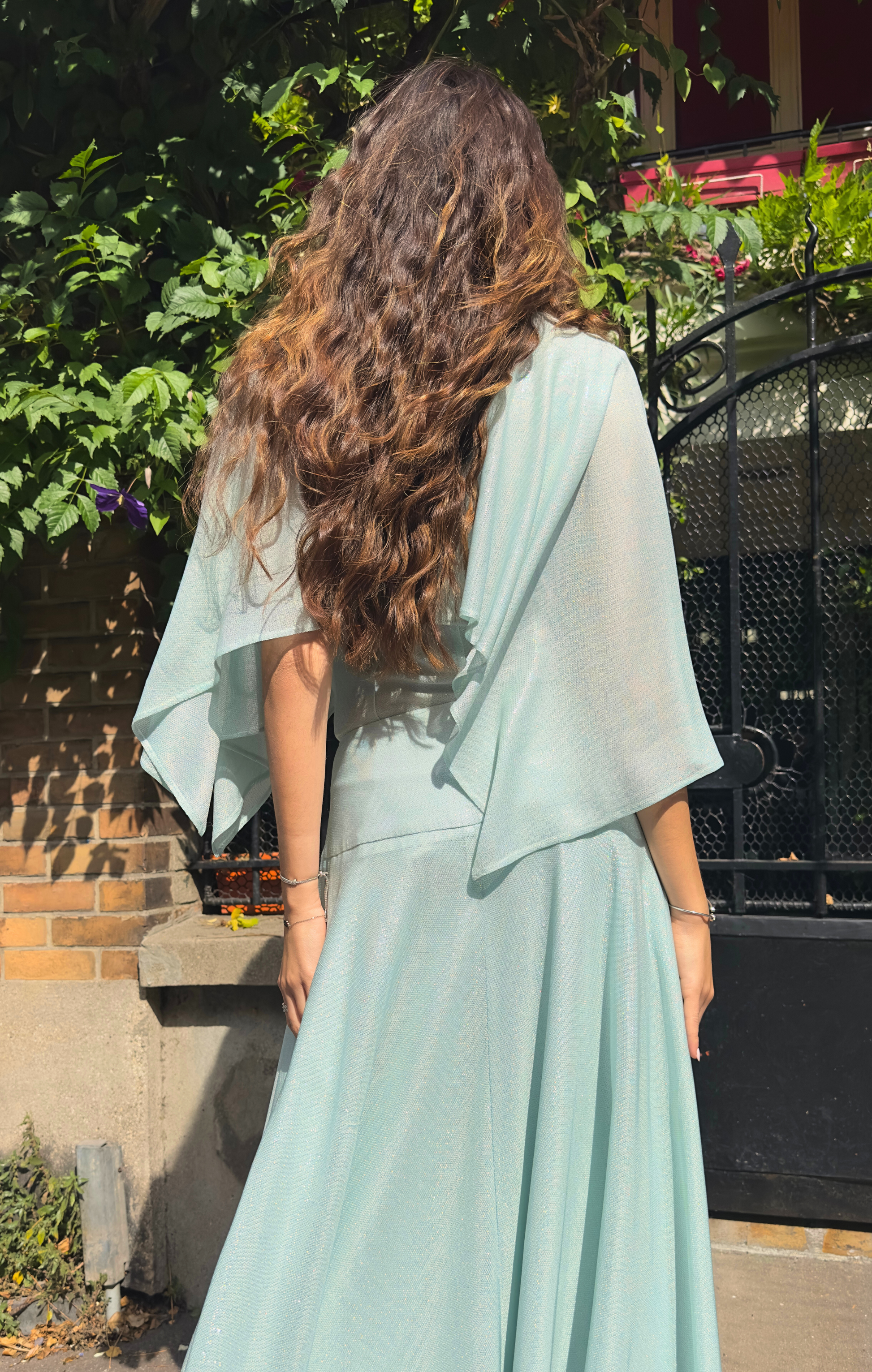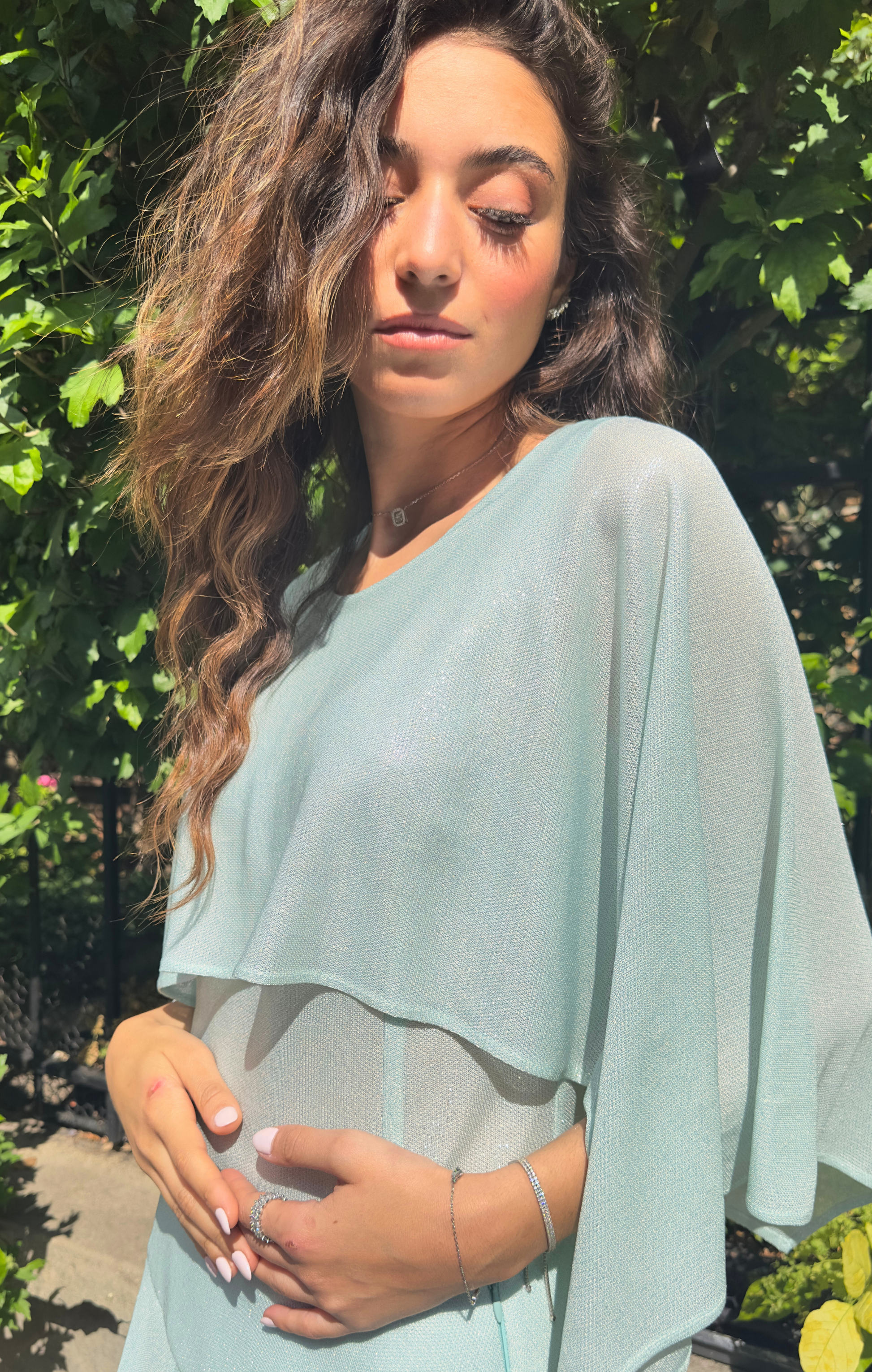 La cape BELLA a été confectionnée dans un tissu aux reflets pailletés. Sa coupe asymétrique lui donne tout son cachet.