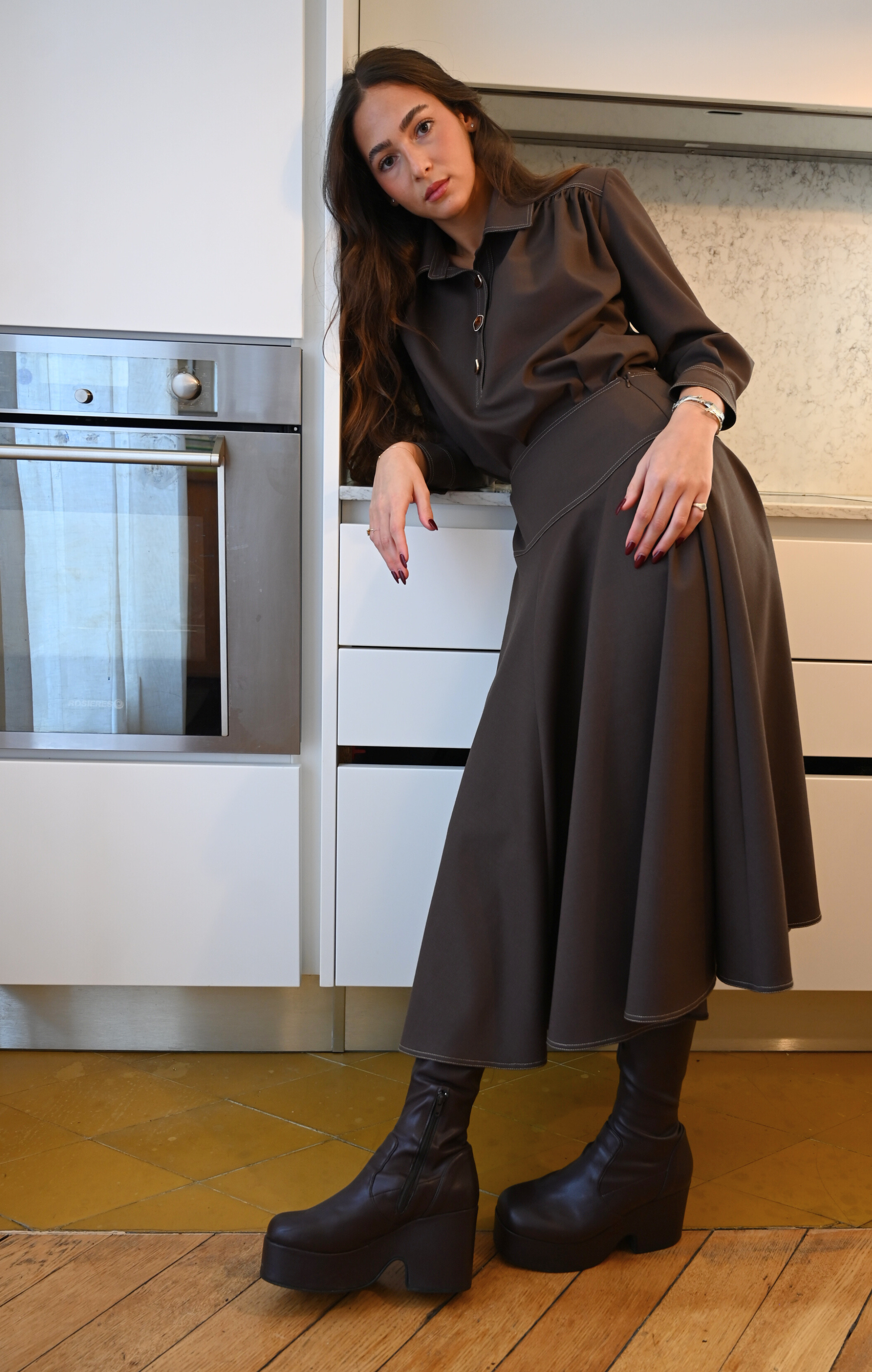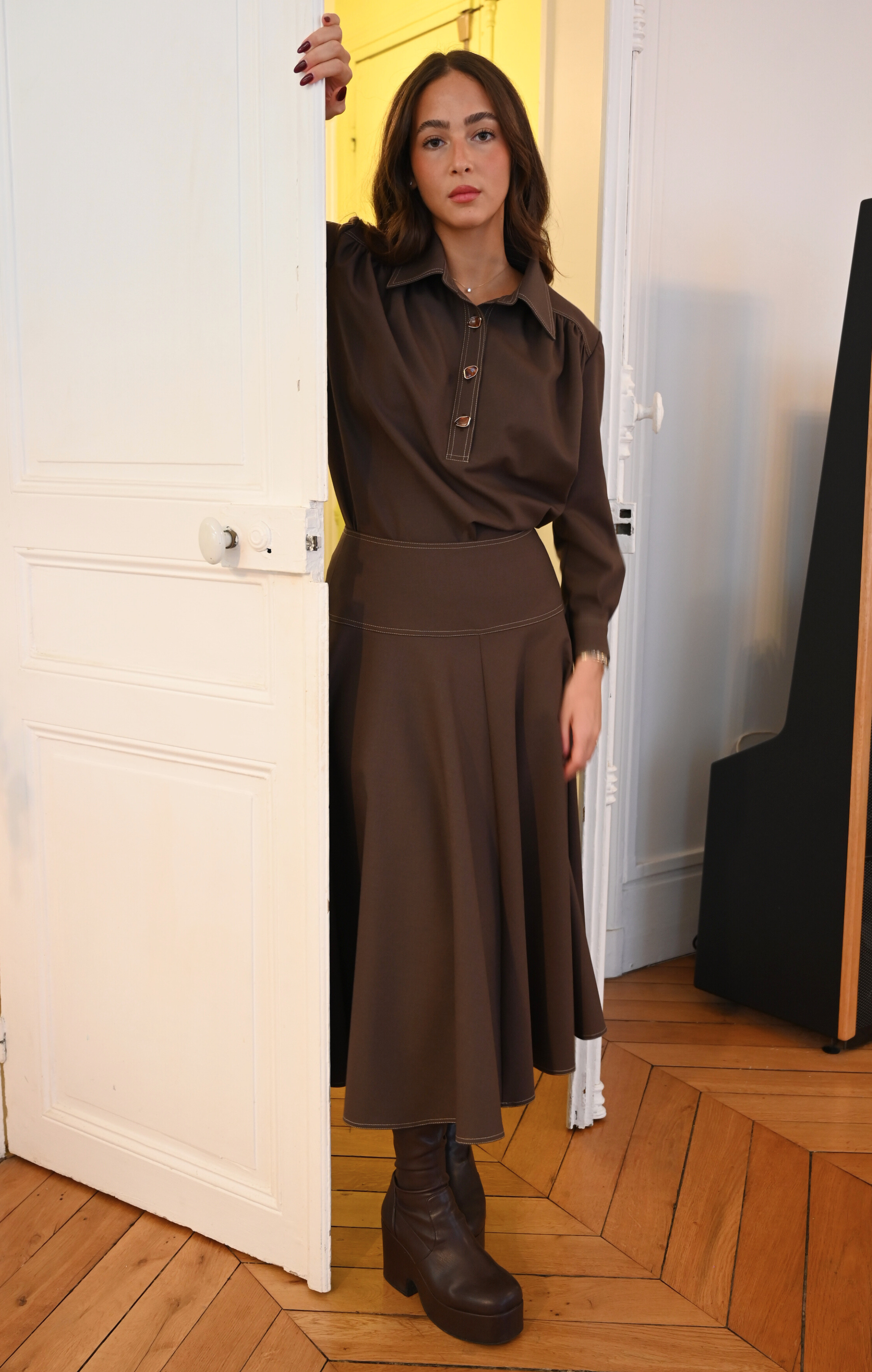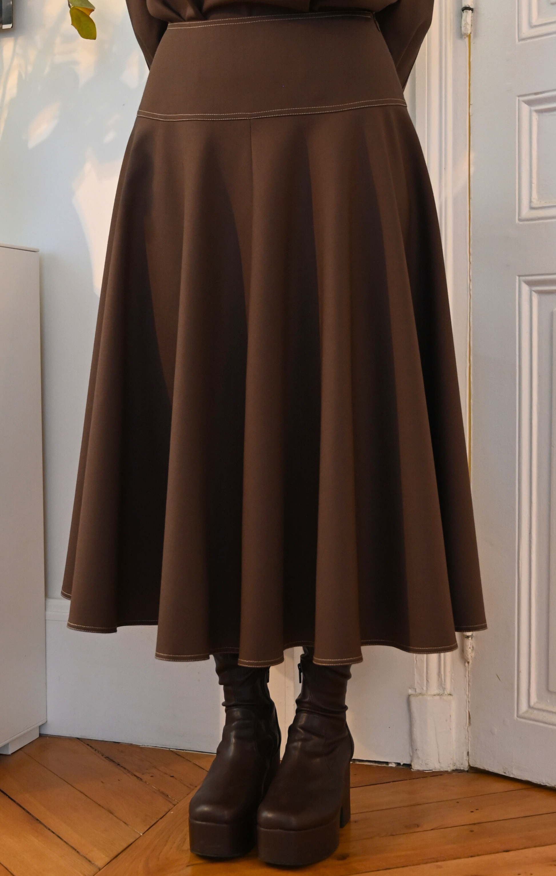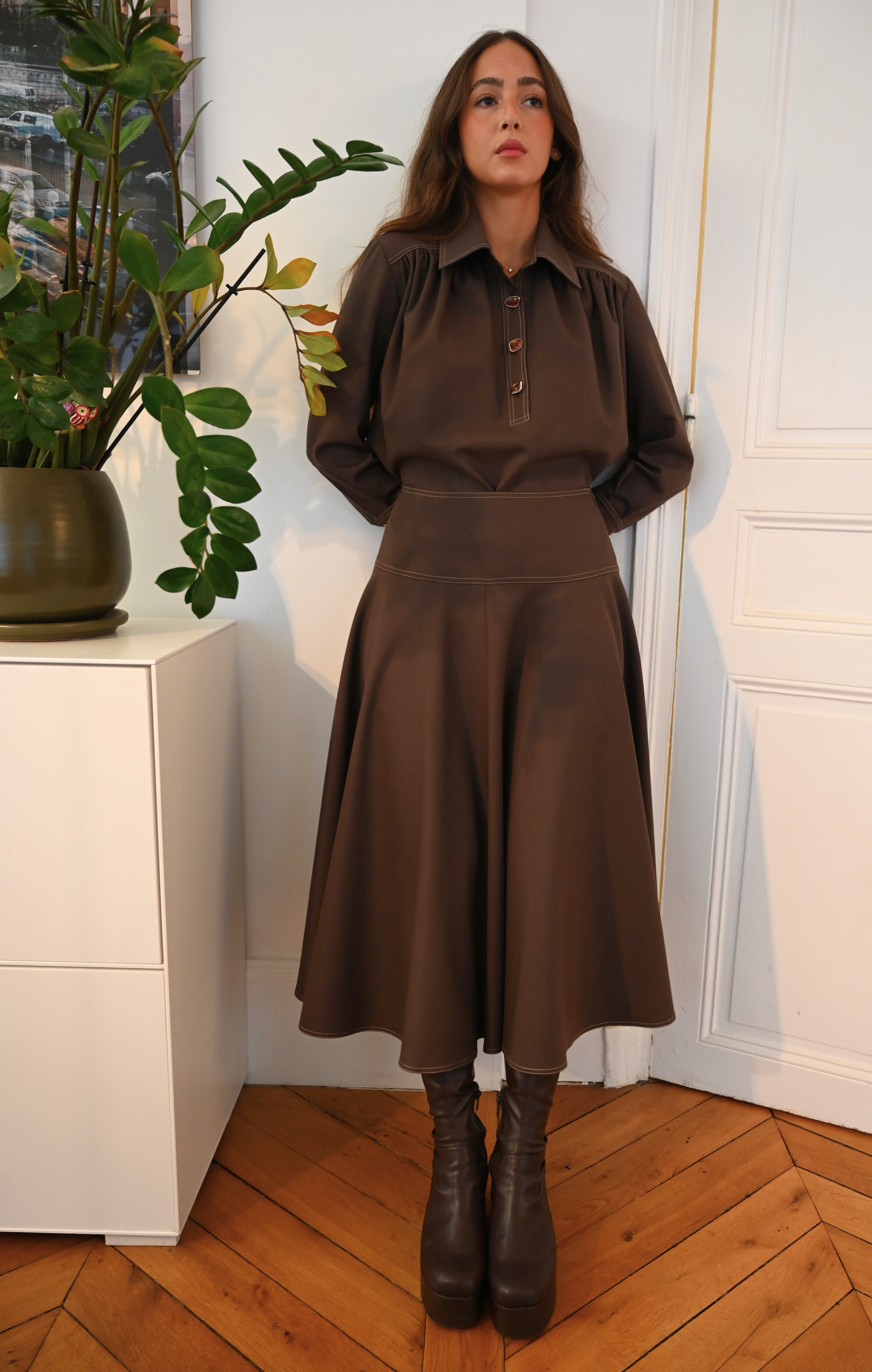 La jupe BETTY est confectionnée dans un beau lainage marron. Ses détails de surpiqures illuminent la pièce. Son volume généreux et sa longueur midi lui donne tout son charme.