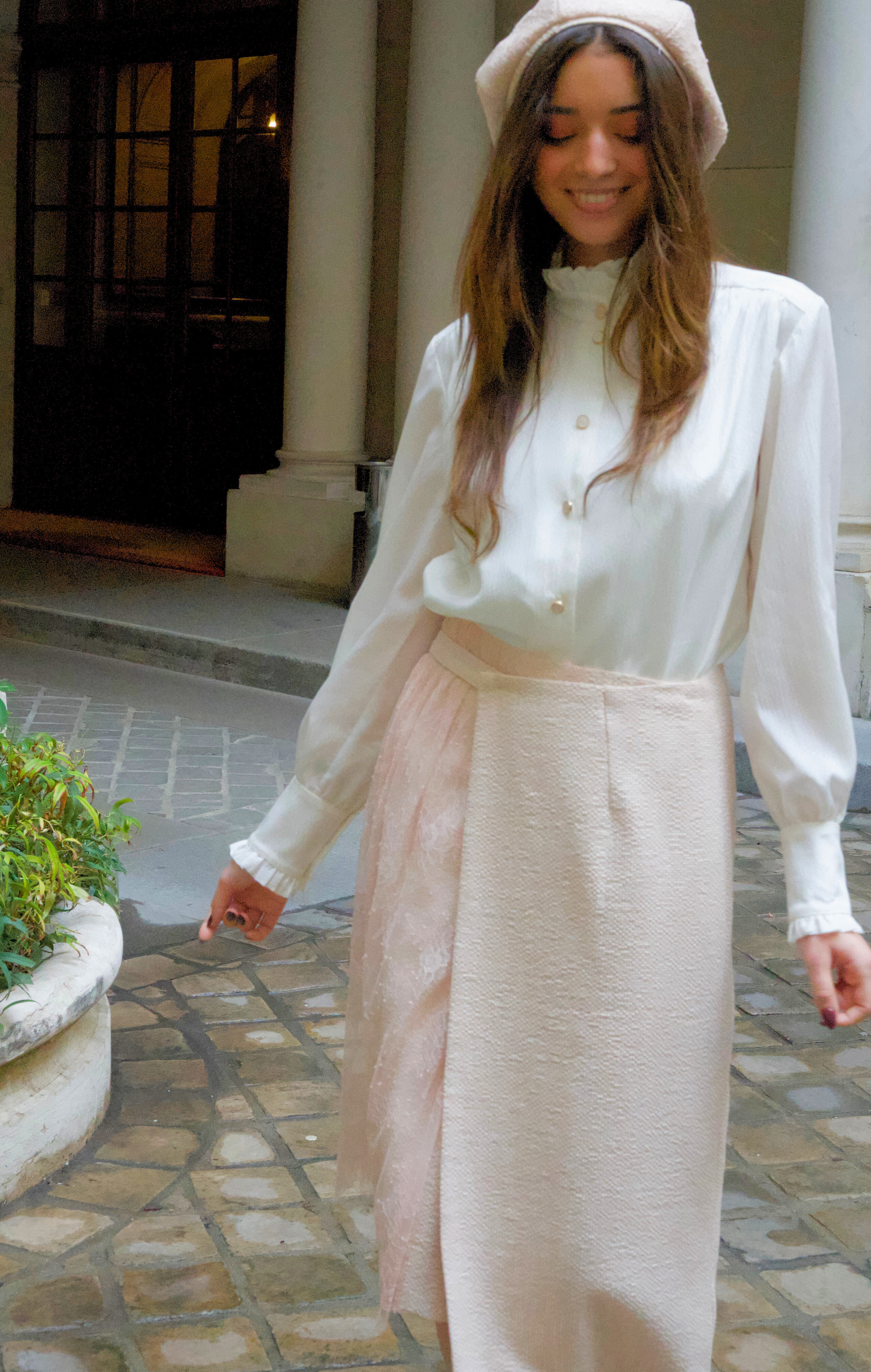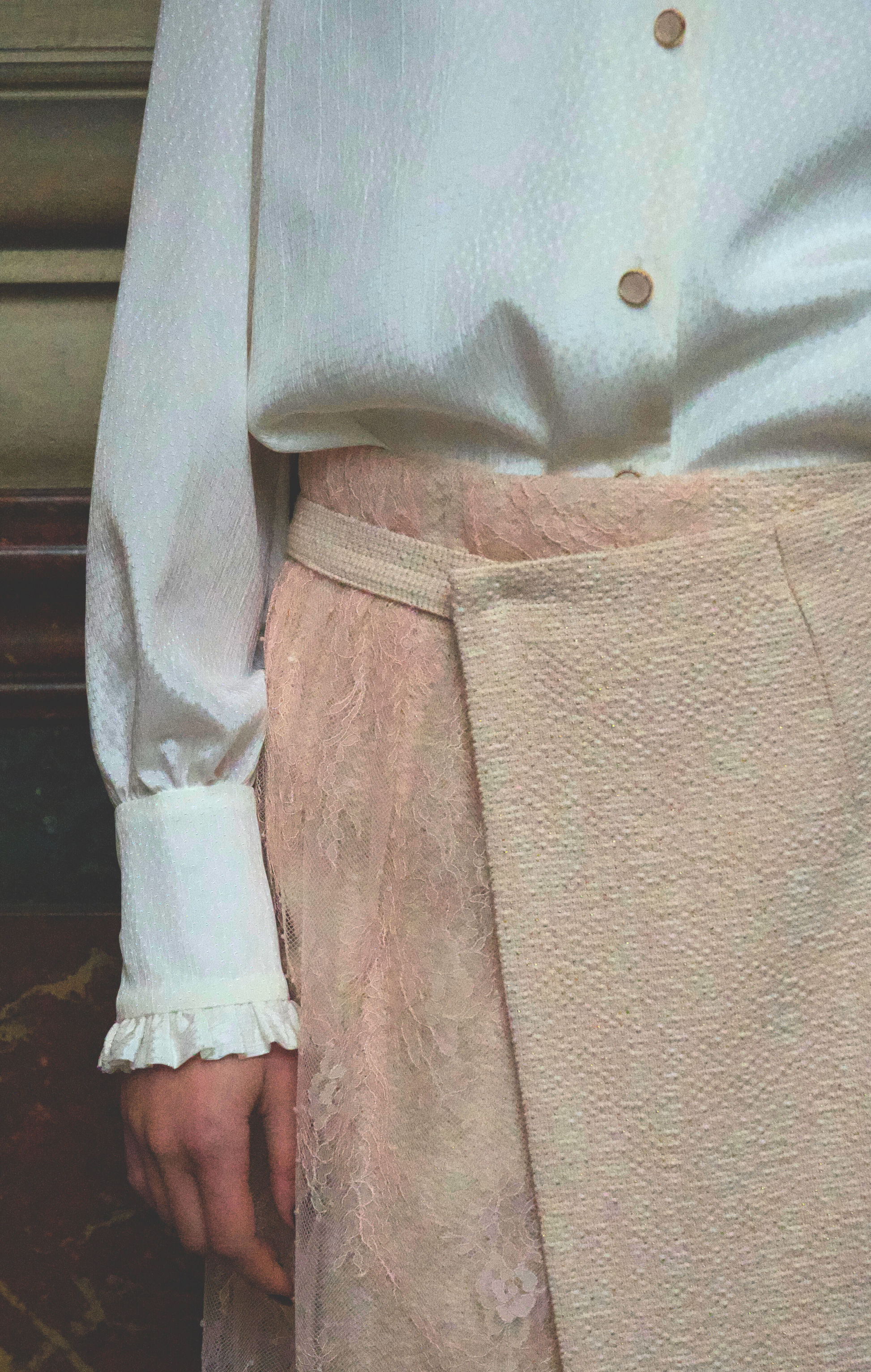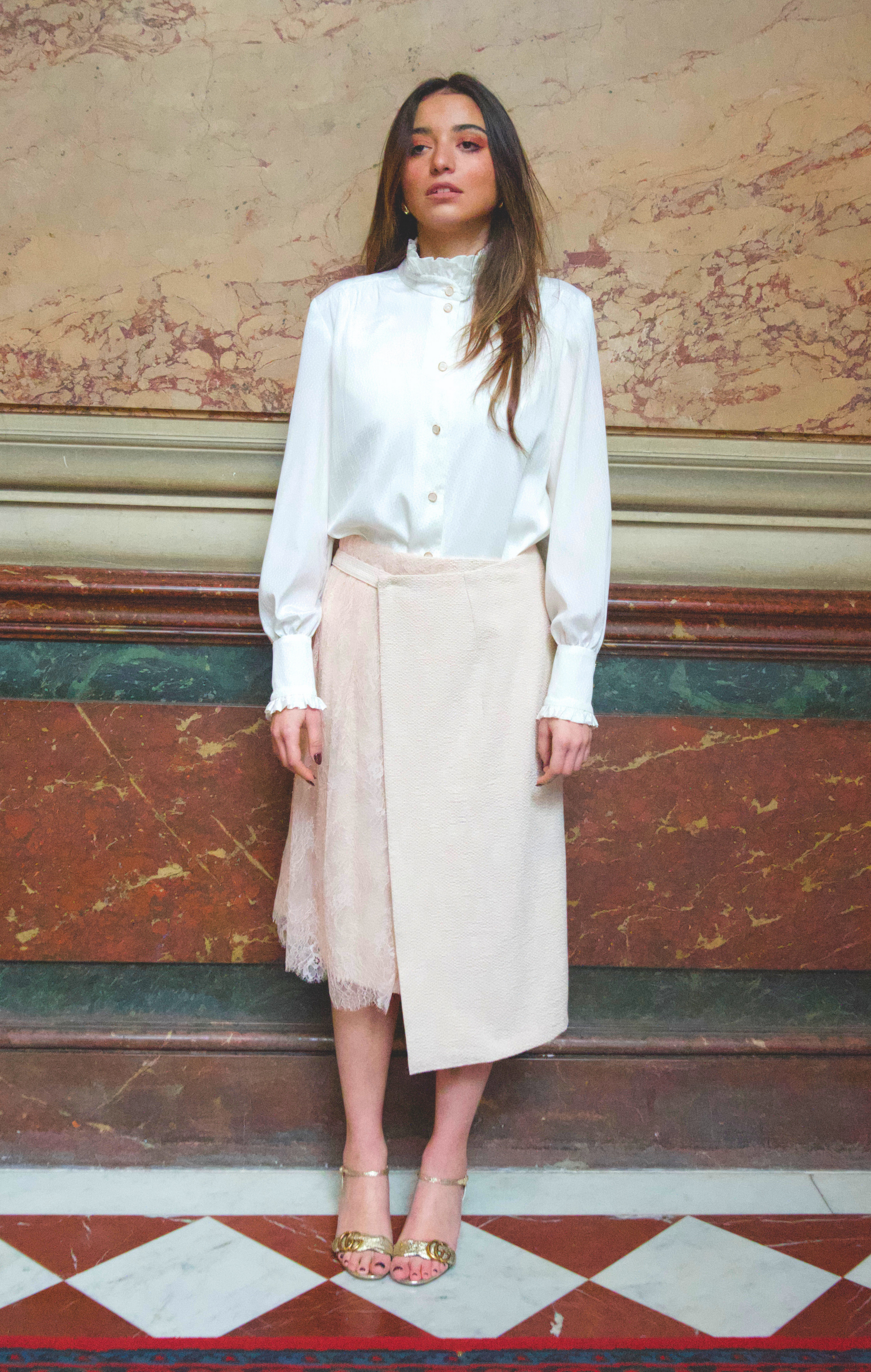 La jupe ELINA est travaillée en porte-feuille, avec une superposition de tweed et de dentelle. Sa coupe est légèrement évasée et asymétrique.