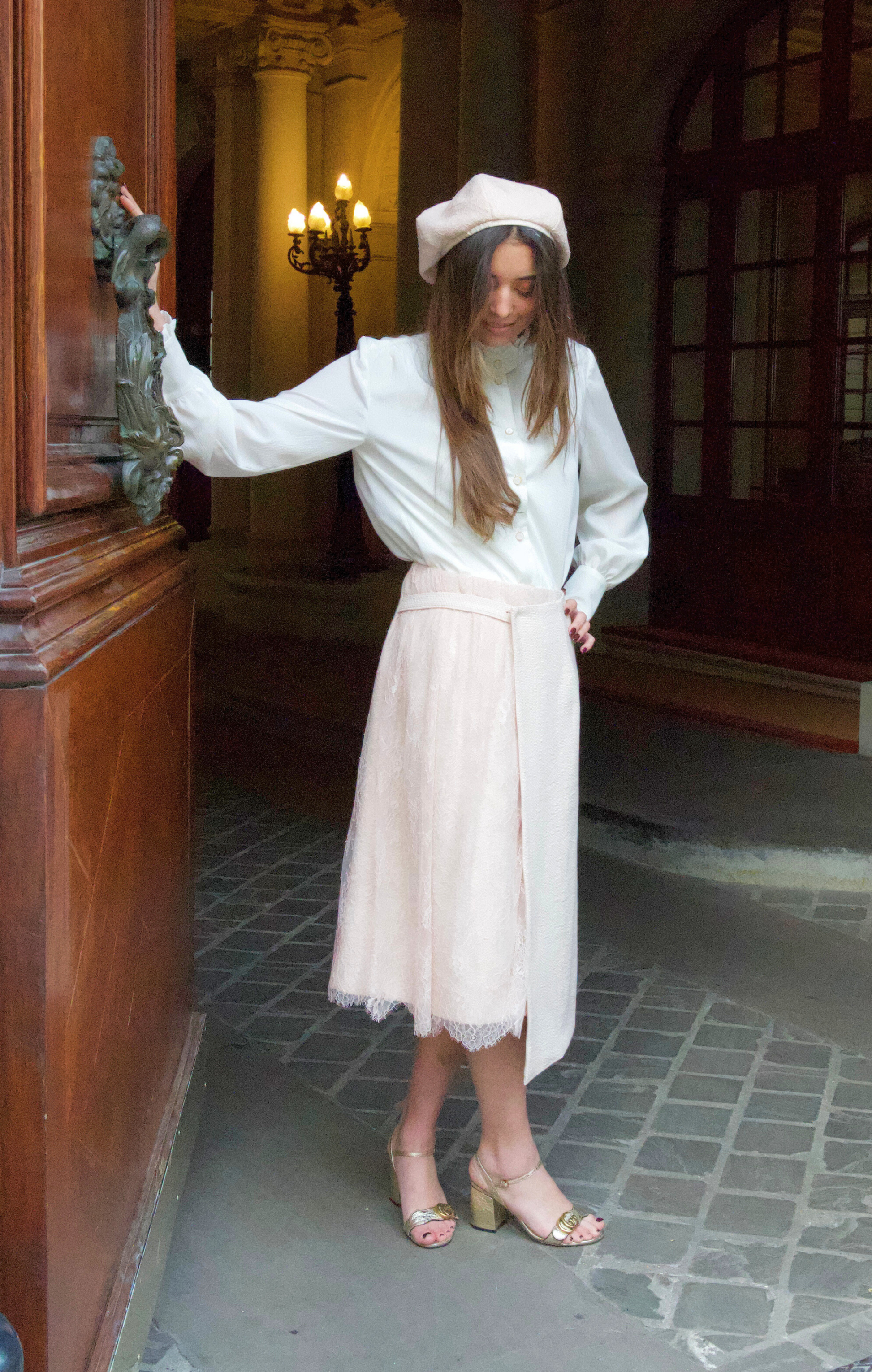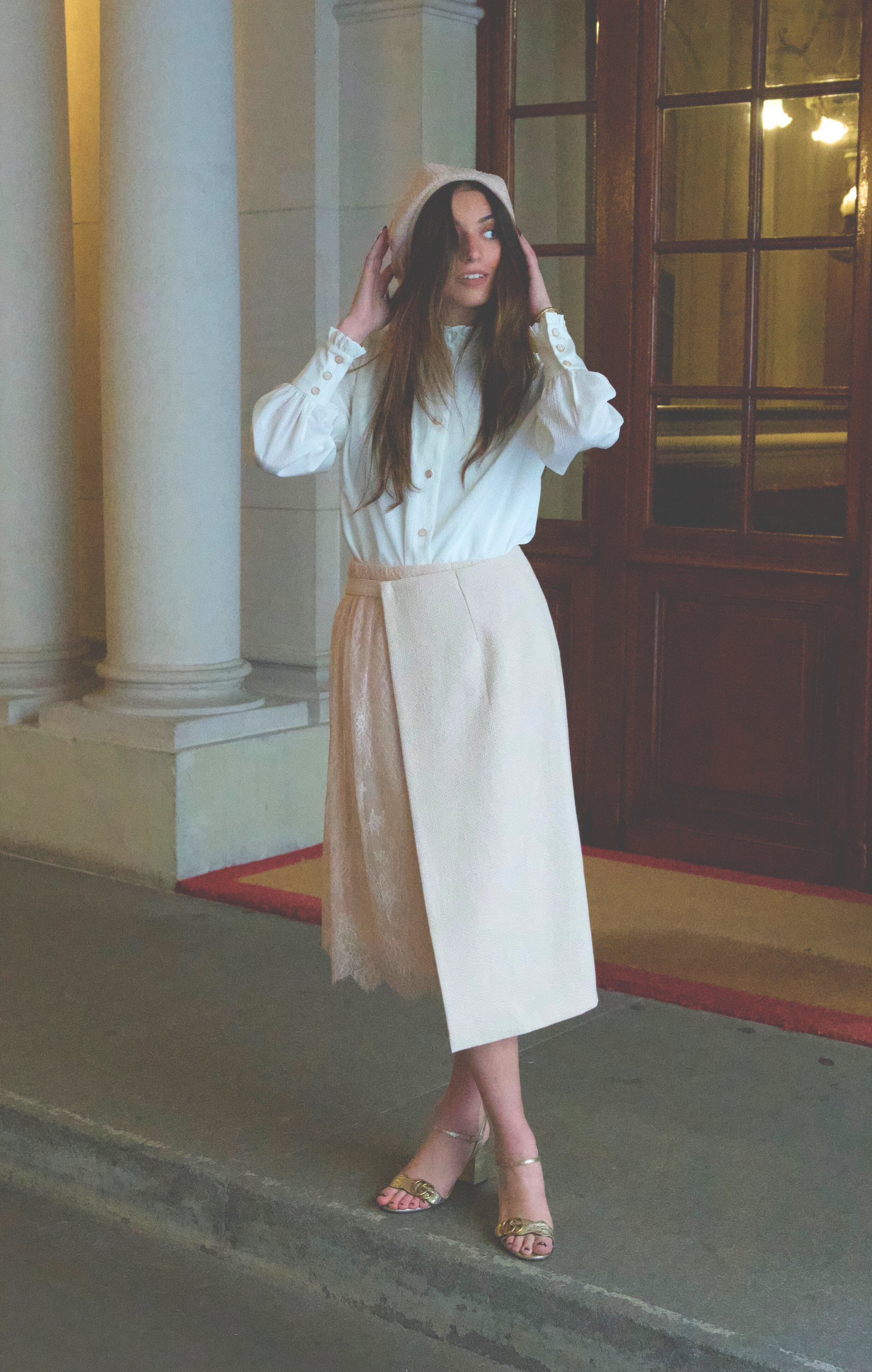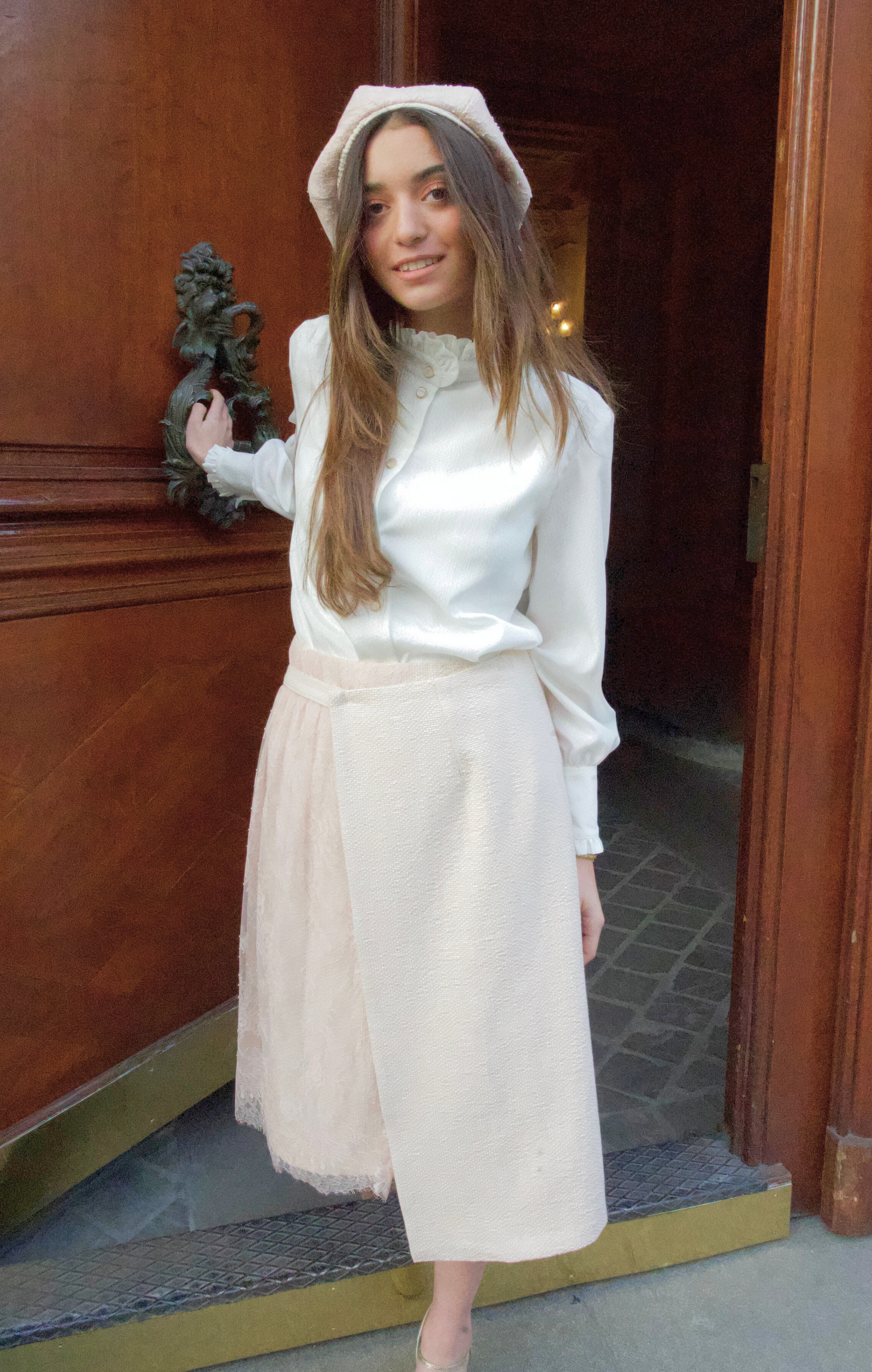 La jupe ELINA est travaillée en porte-feuille, avec une superposition de tweed et de dentelle. Sa coupe est légèrement évasée et asymétrique.