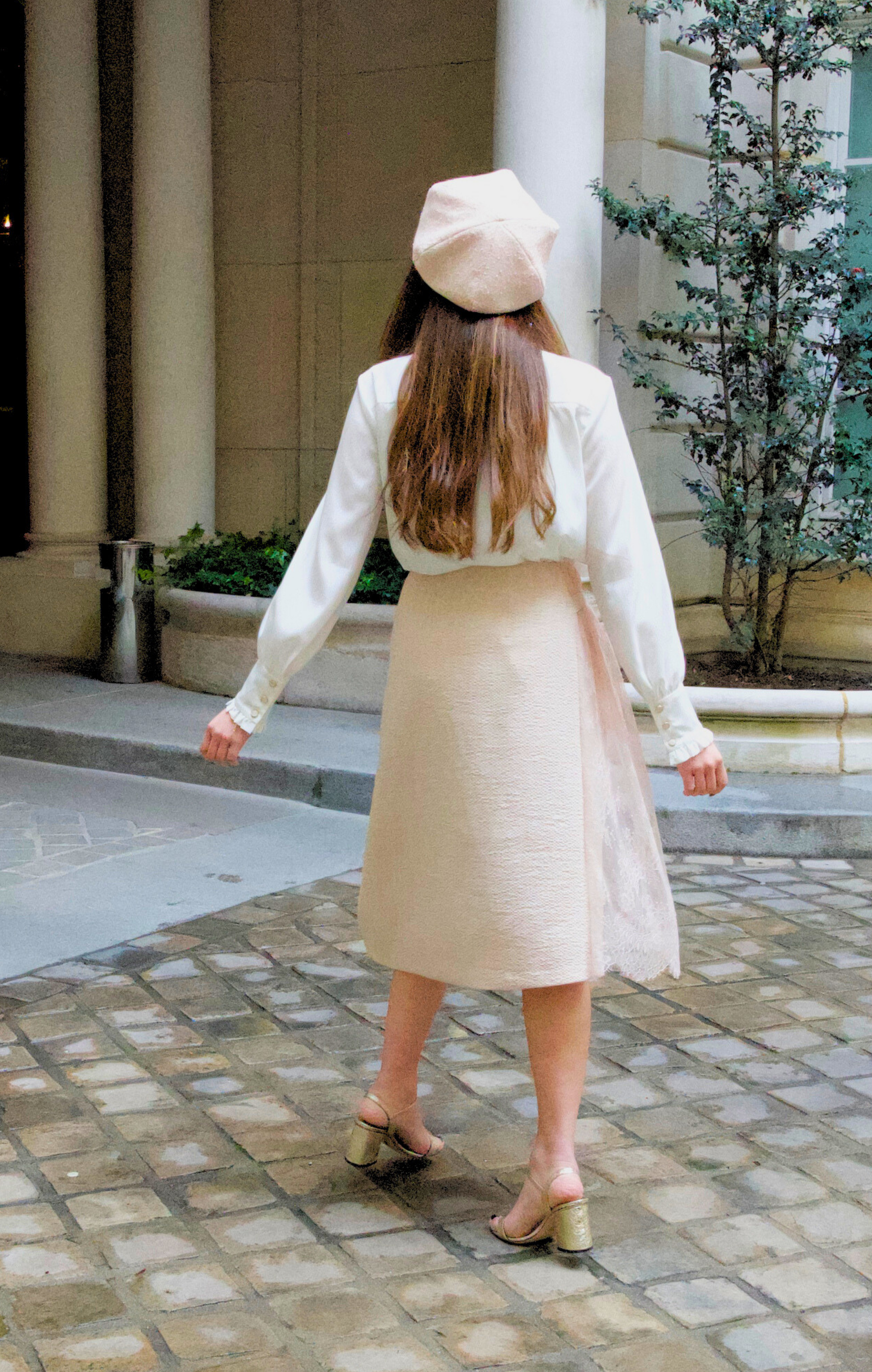 ◆ Jupe midi porte-feuille en tweed et dentelle