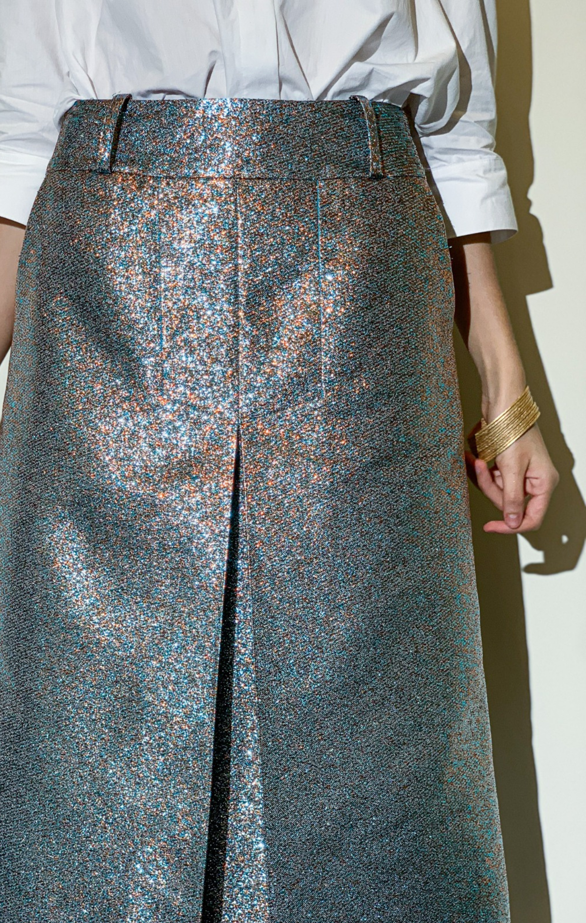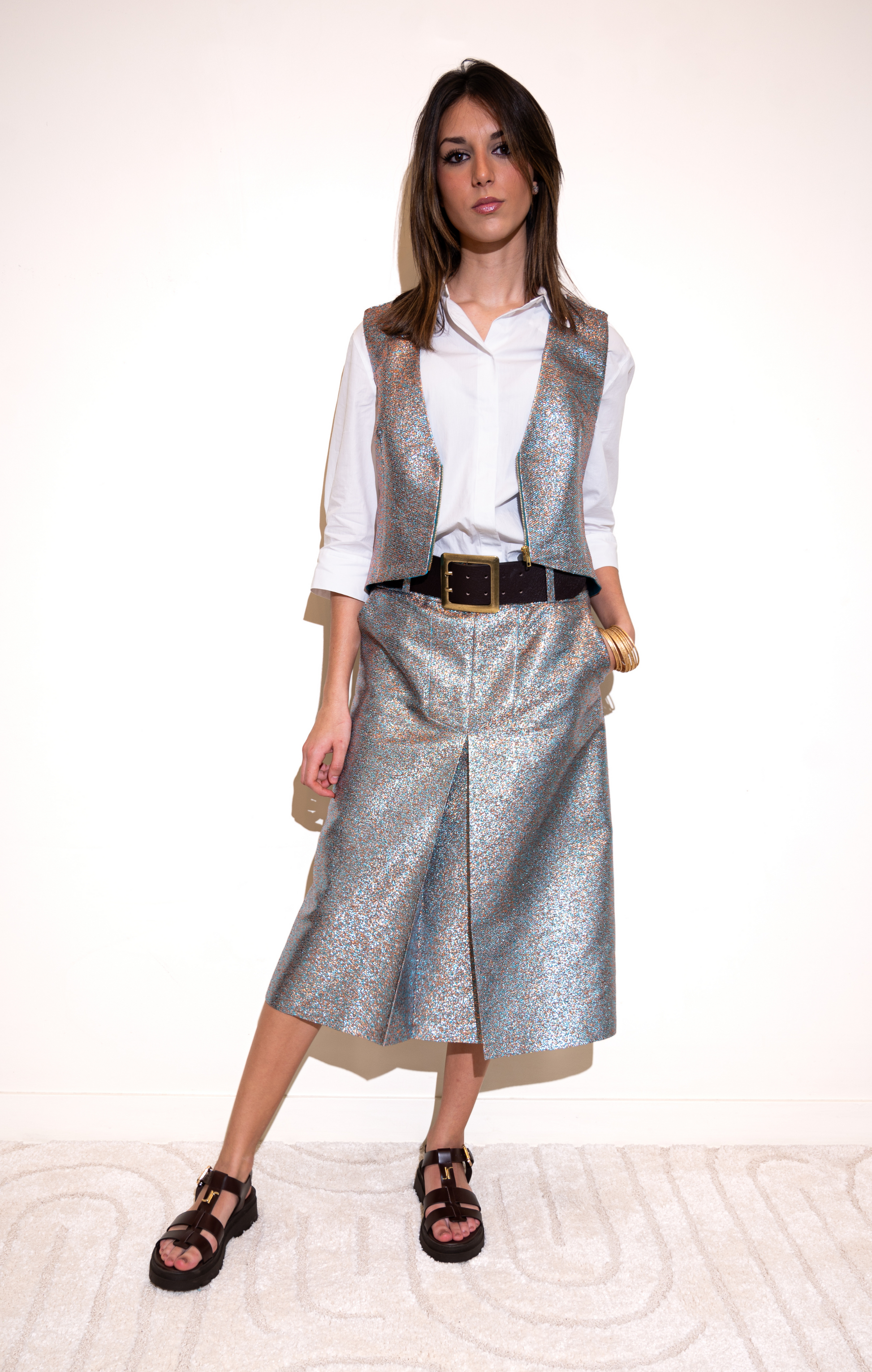 La jupe JESS présente une coupe "daywear" dans un tissu fantaisie très lumineux. Elle est dotée de poches italiennes, d'un plis creux devant et de passants pour ceinture. Elle peut être portée en total look assortie à son veston GABY, ou au contraire dépareillée, avec un tee-shirt uni.