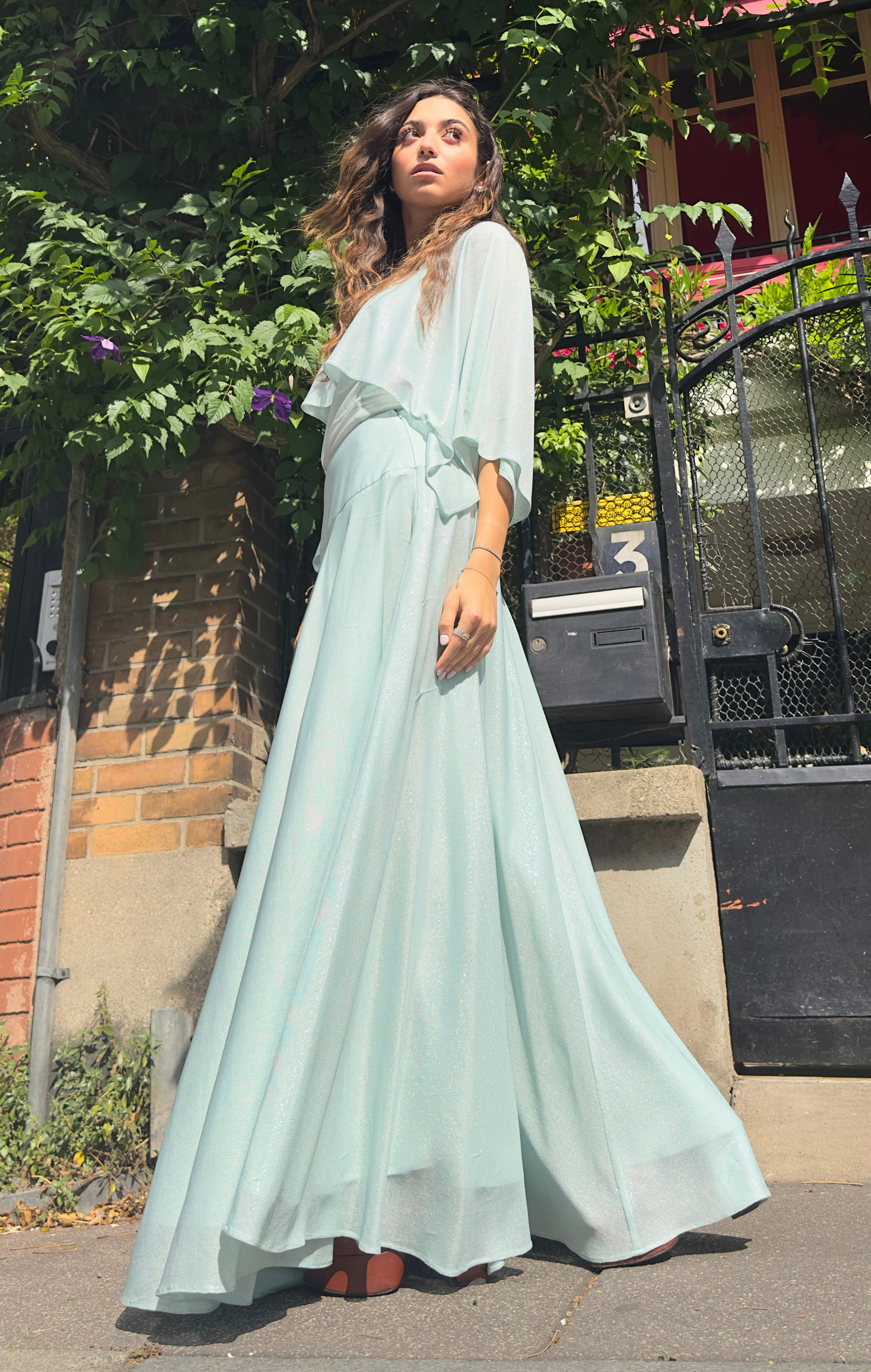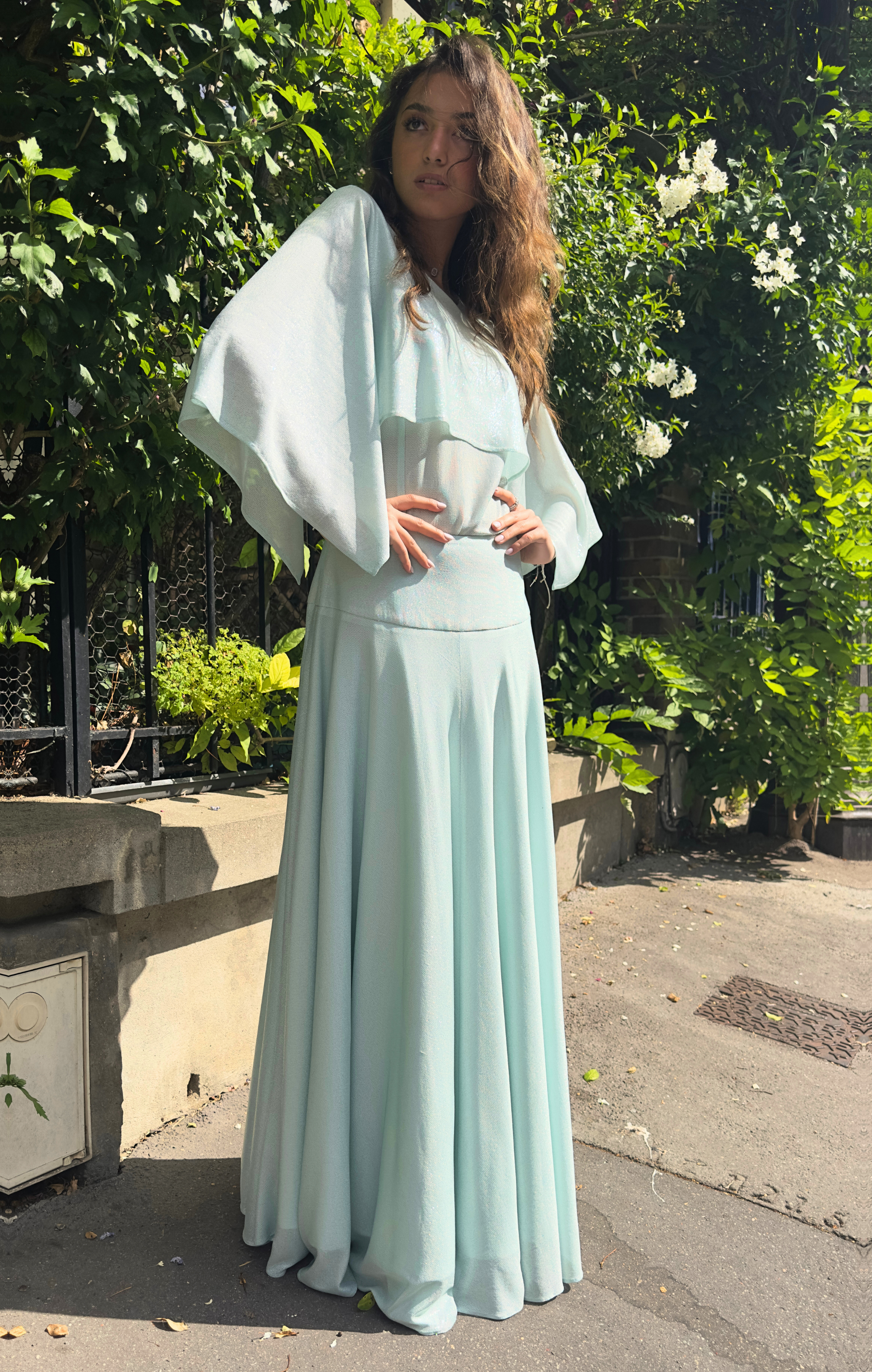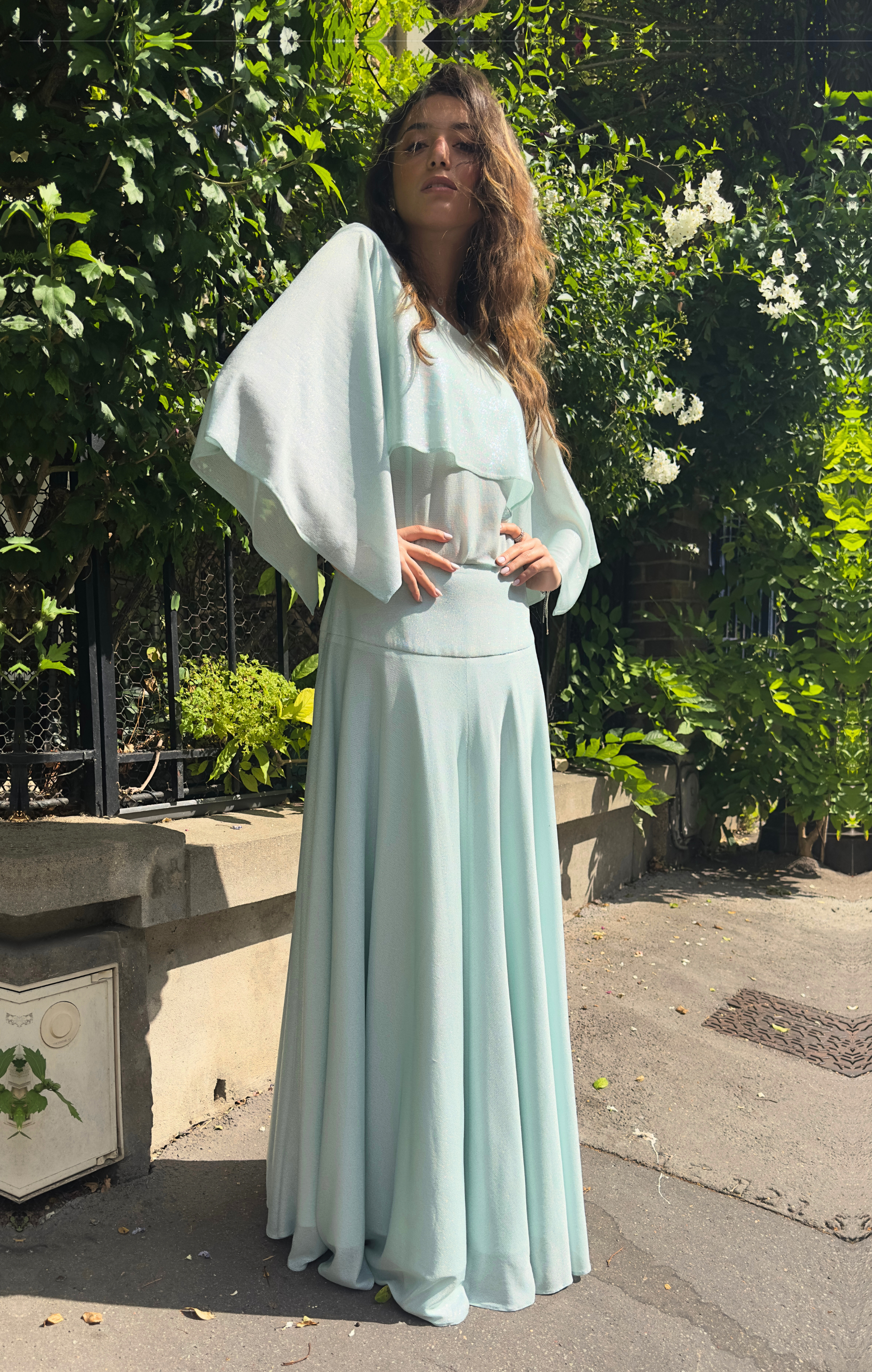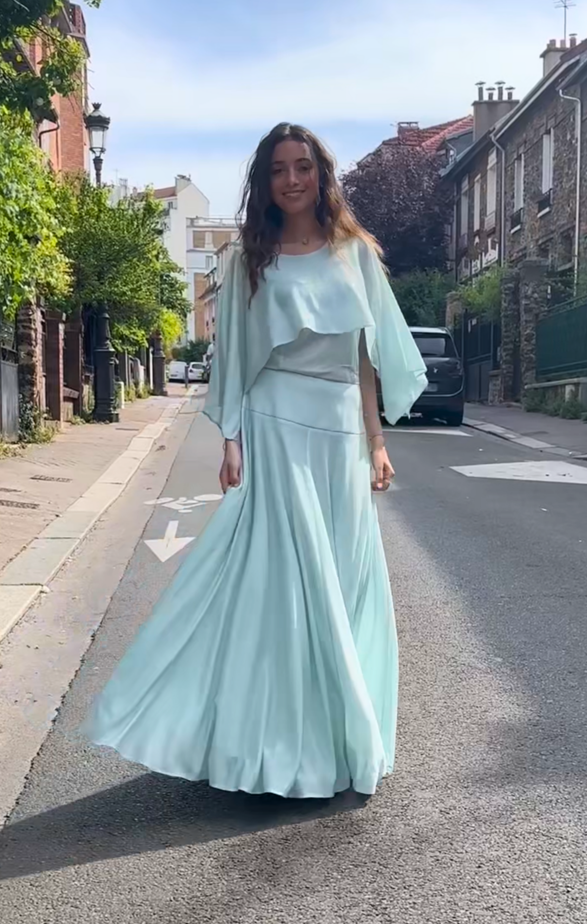 La jupe KIM confectionnée dans un tissu fluide vert d’eau rehaussé de sequins subtils. Chaque pas capte la lumière et révèle une brillance délicate. Une pièce aérienne et lumineuse, pensée pour rayonner.