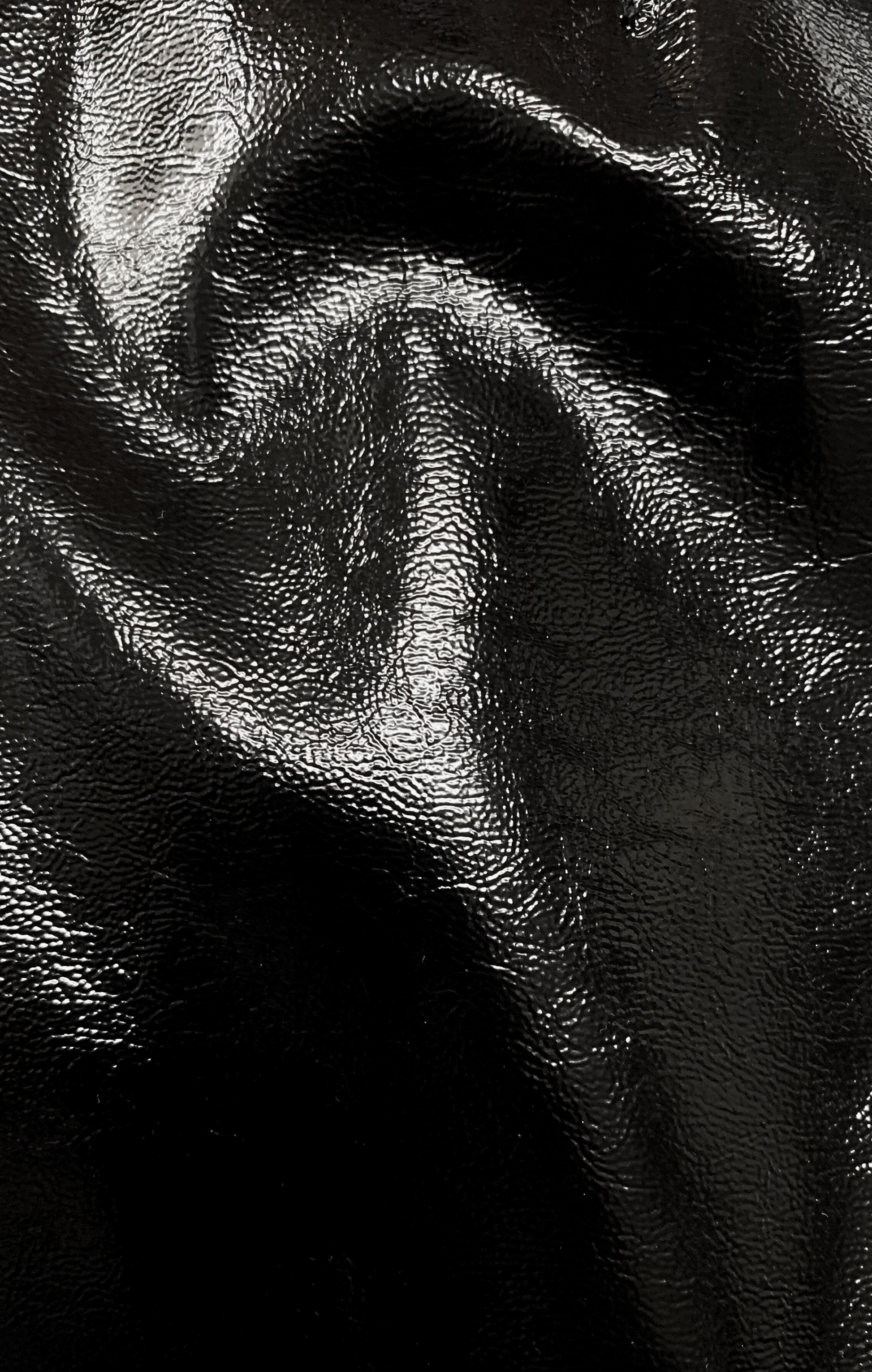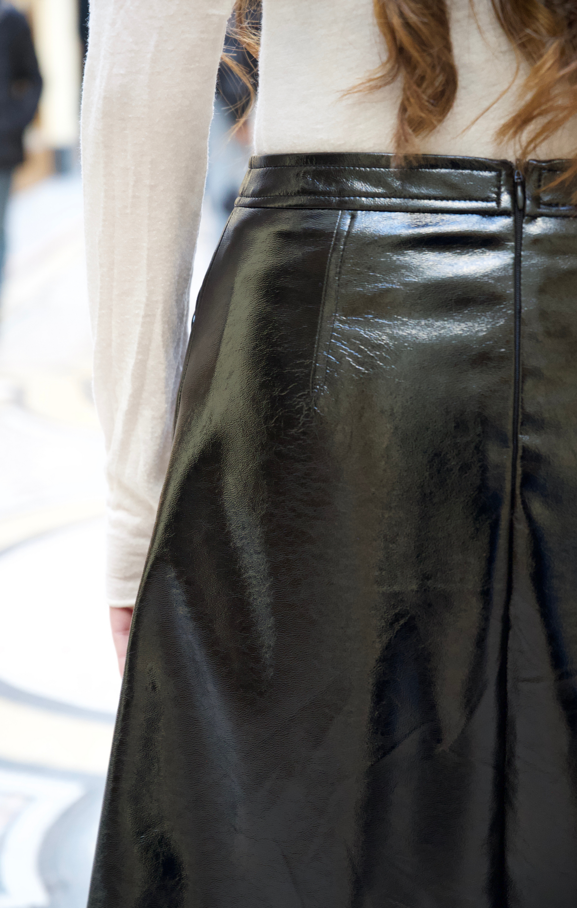La jupe NELLY est travaillée en vinyl, avec des poches fendues à la taille et une coupe légèrement évasée.