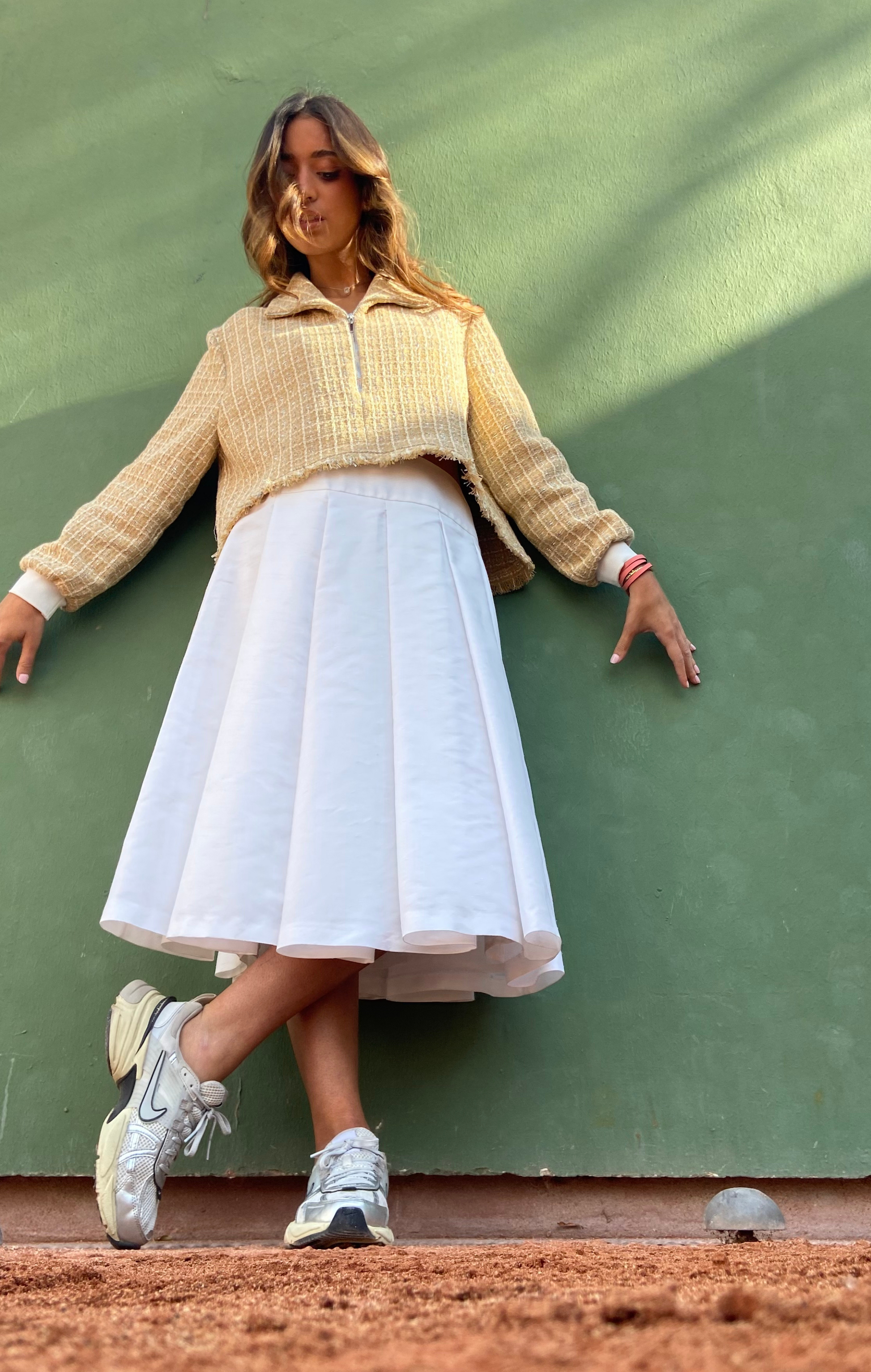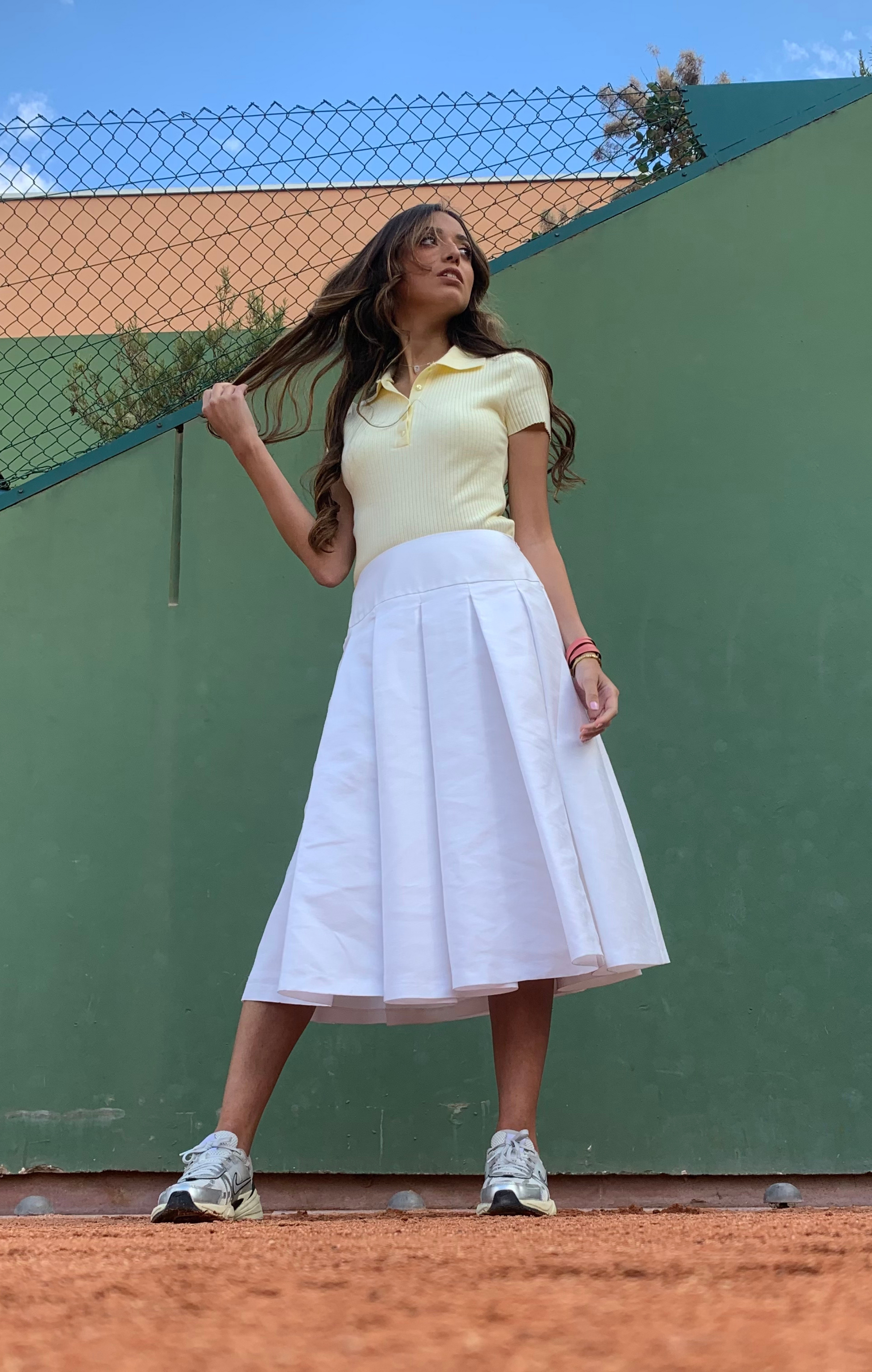 La jupe RACQUET fait écho à celles portées par les TennisWomen. Les hanches sont maintenues par une large découpe. Le jeu de plis plats sur la jupe assure une aisance pour chacun de vos mouvements. Portez-la avec le top SMASH pour compléter votre look.