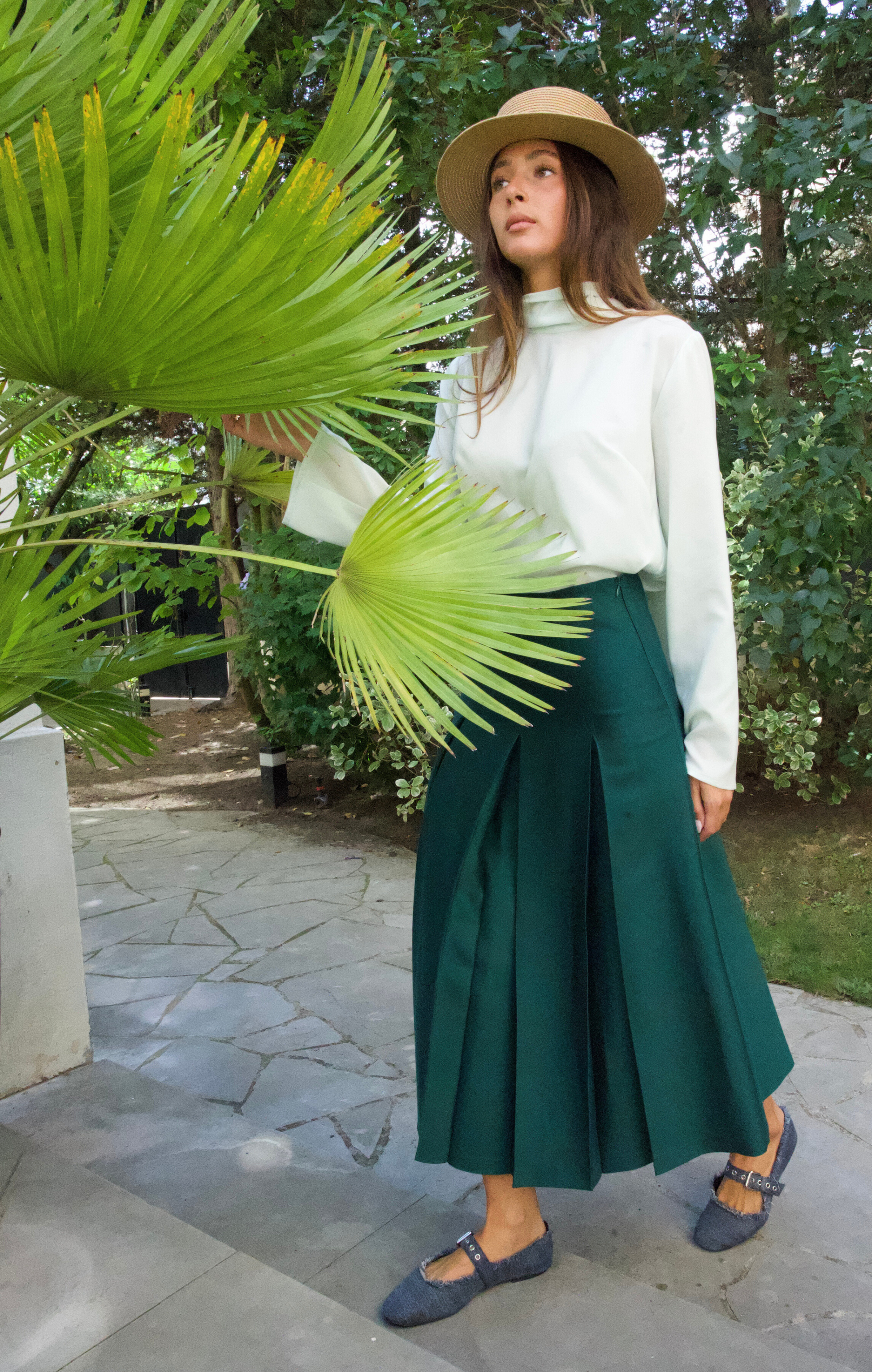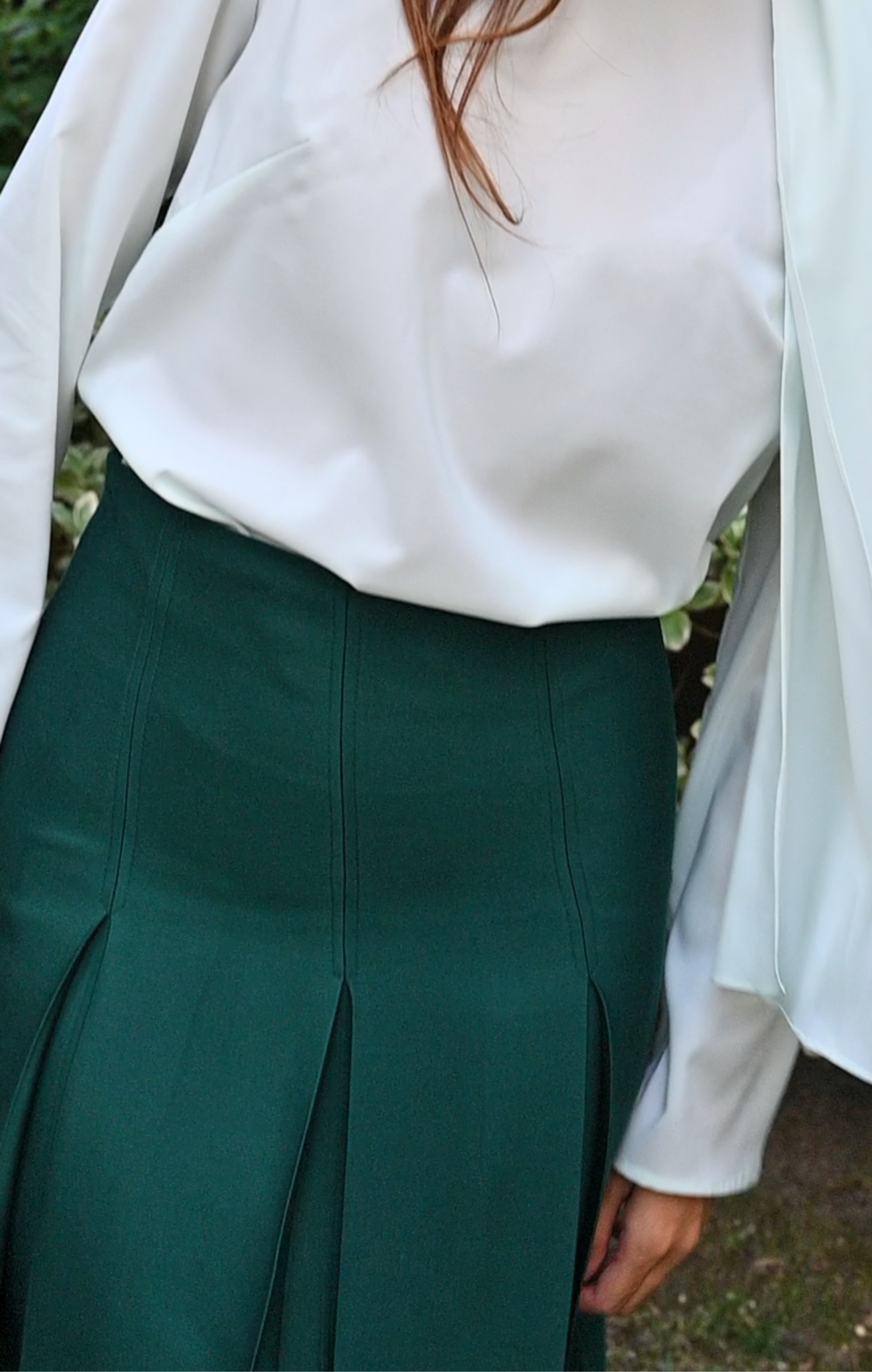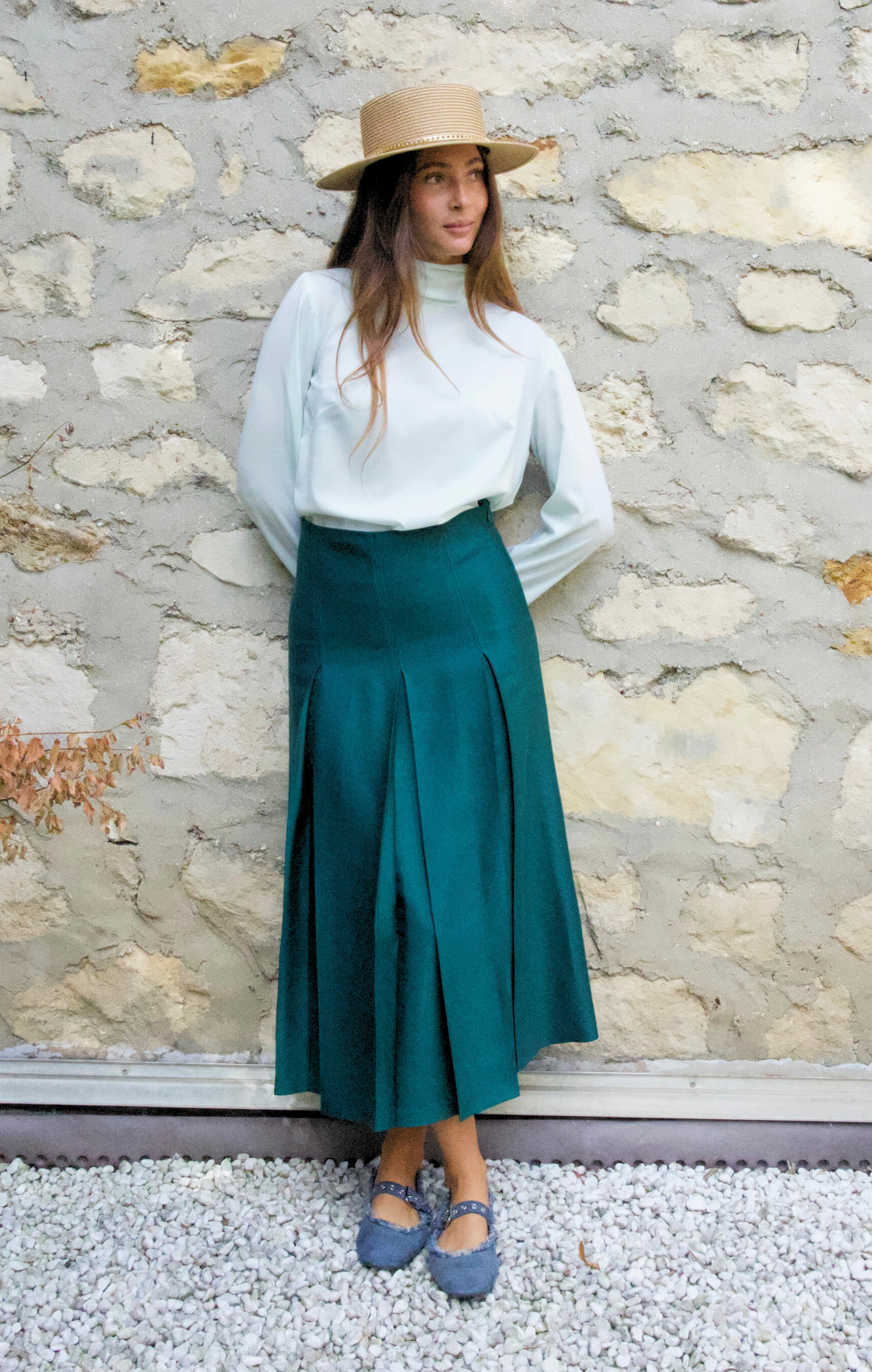 La jupe TAEL présente un jeu de plis au devant et au dos. La coupe est fluide, mais les hanches sont maintenues par un jeu de surpiqures.