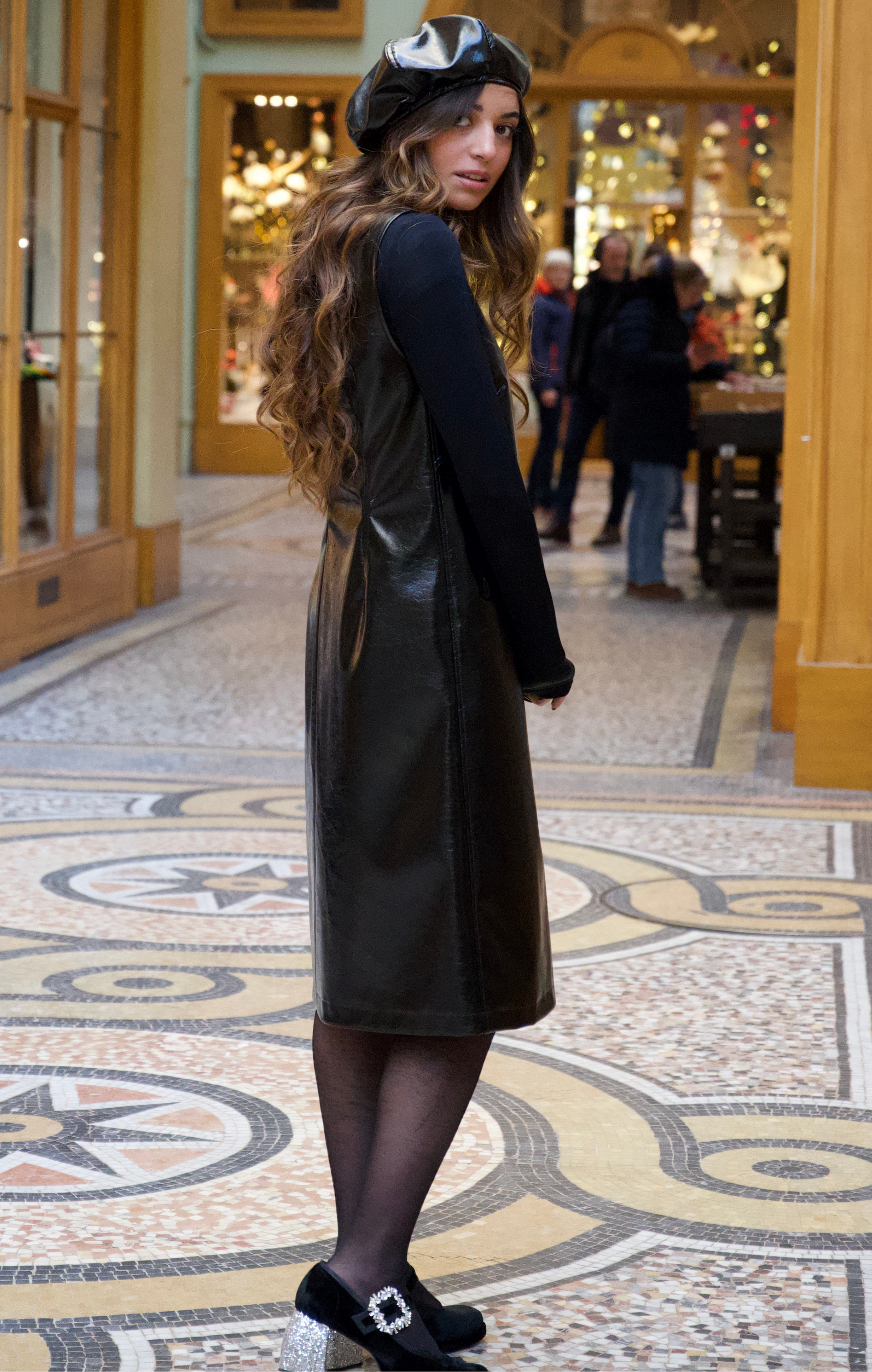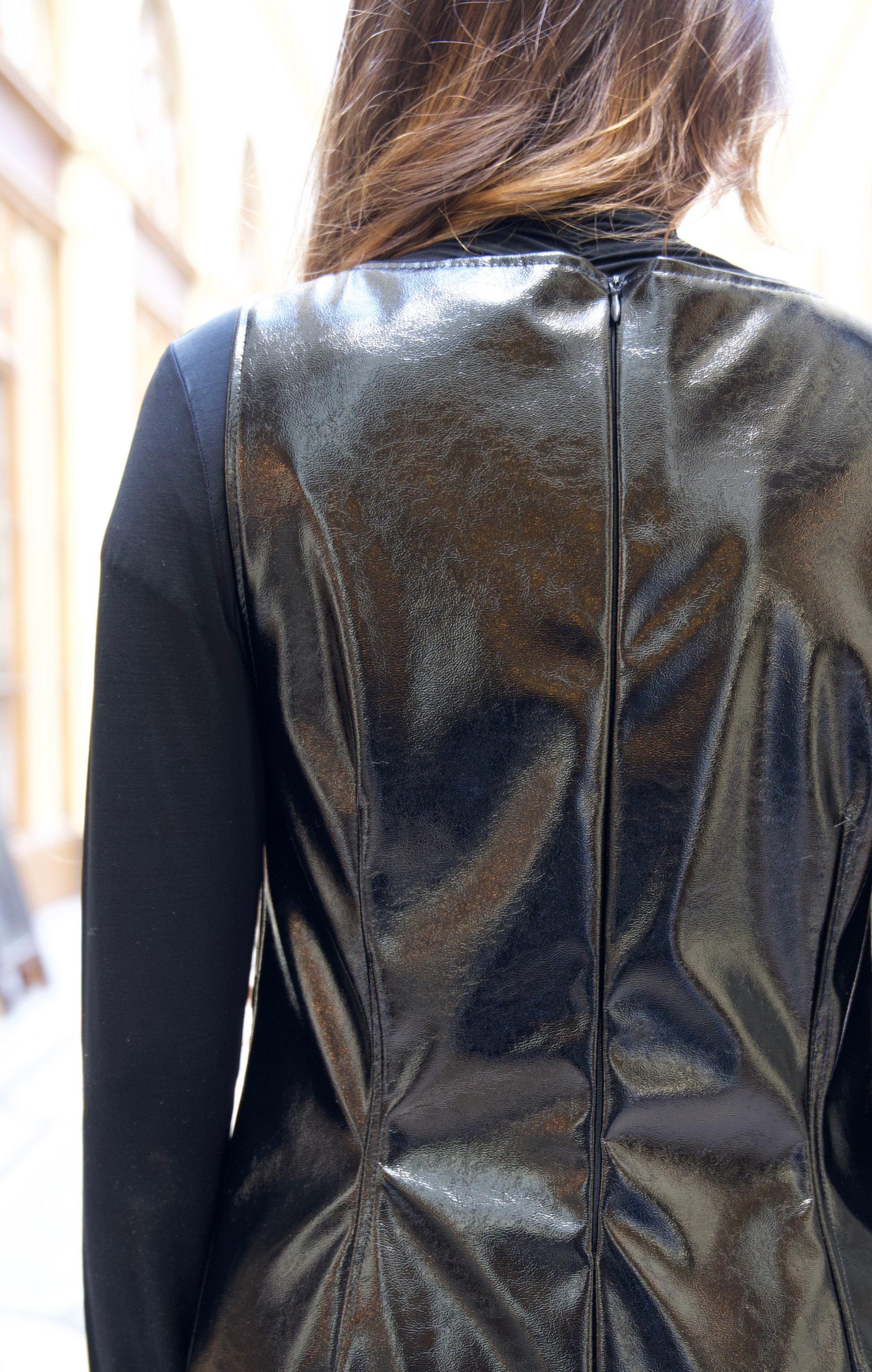 La robe NAVA est coupée dans un tissu vinyl craquelé, brillant et souple à la fois. Elle est légèrement évasée, avec des surpiqûres ton sur ton et des poches passepoilées aux hanches.
