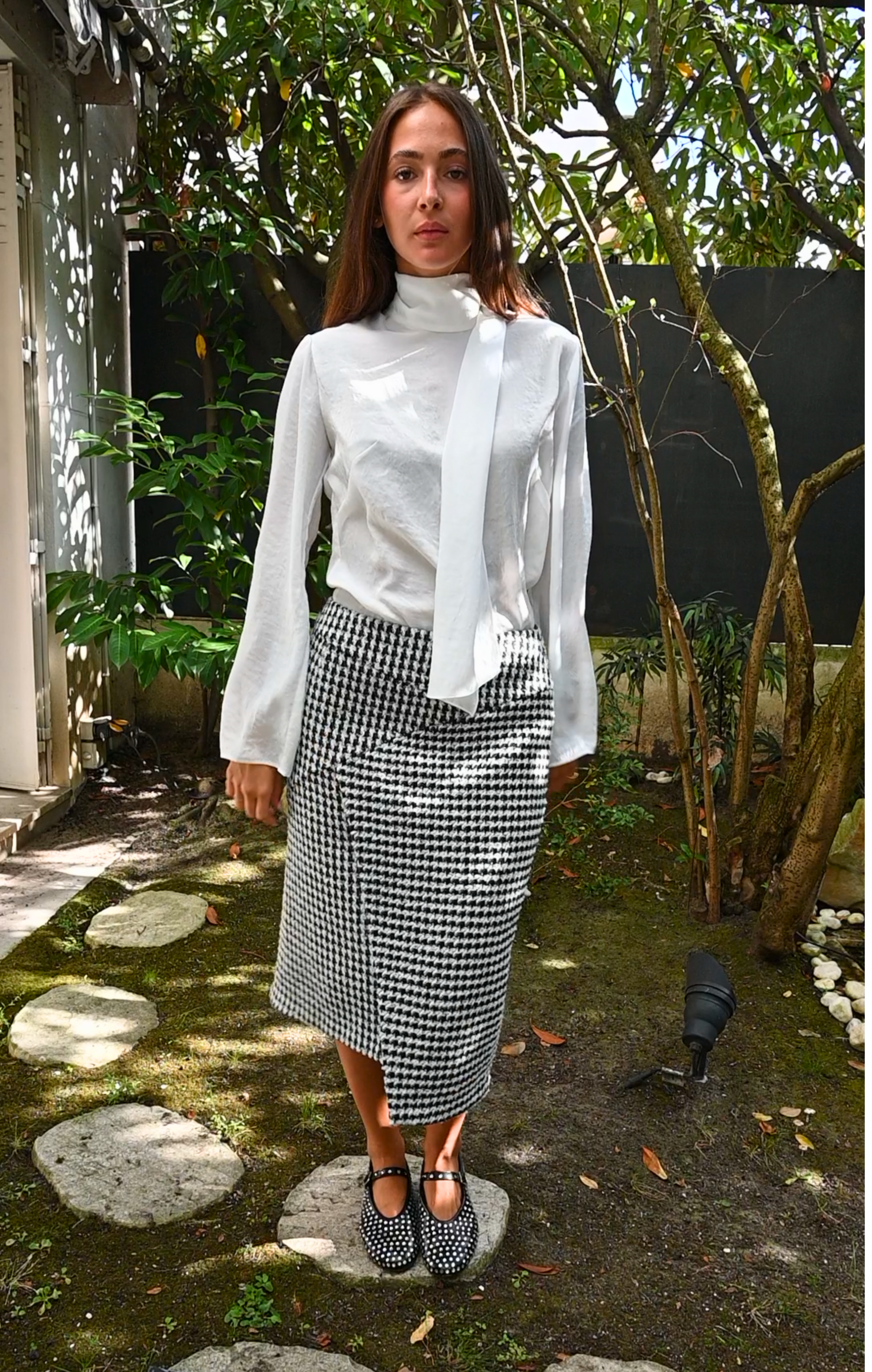 Le top DALIA présente une coupe fluide avec un col montant à nouer. Il a été réalisé dans un tissu lumineux à effet martelé.
