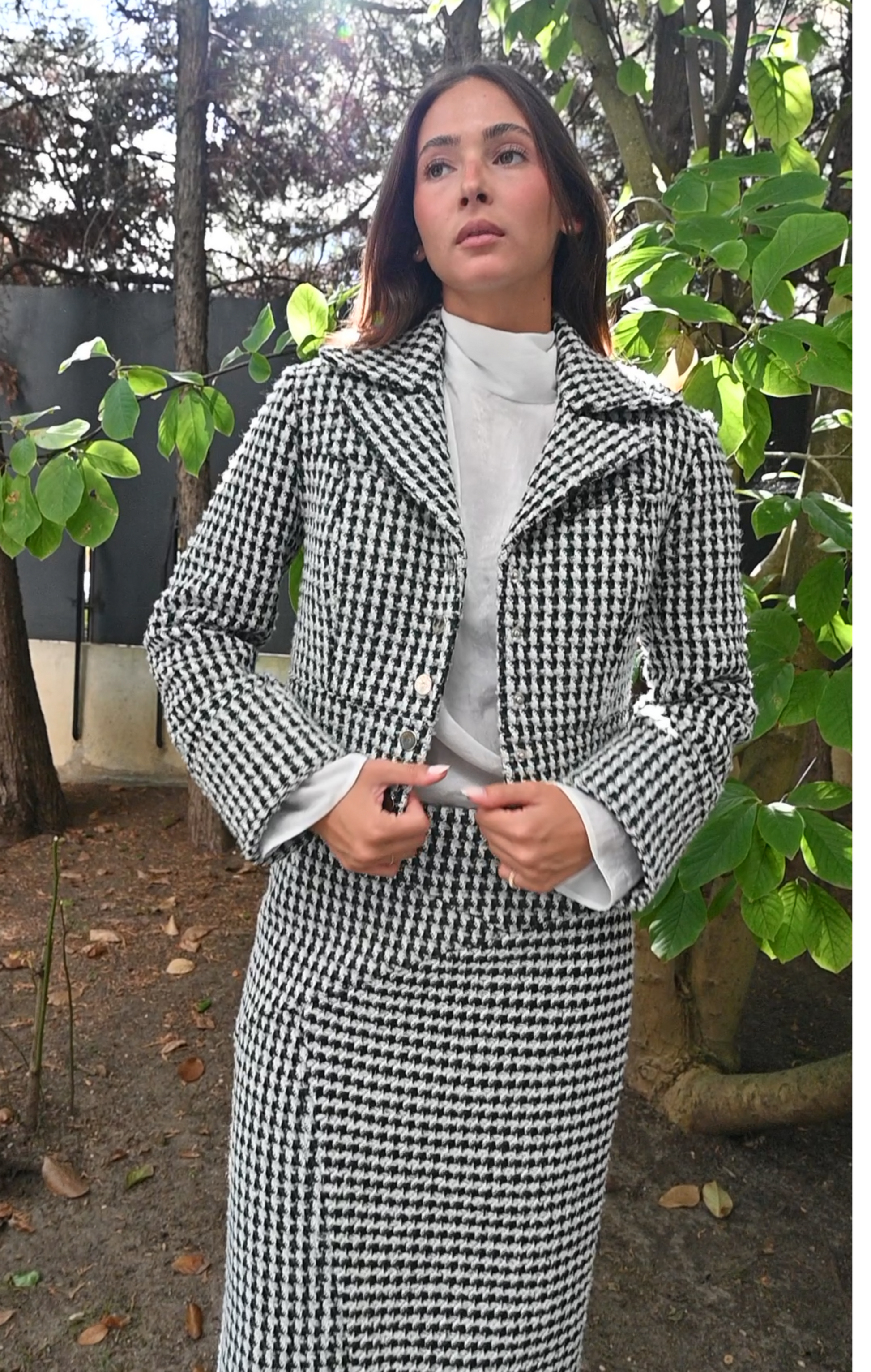 La veste ADELE présente un volume très moderne avec son col tailleur revisité et sa coupe courte fittée. Elle est dotée de hauts poignets, et de deux poches à la poitrine.